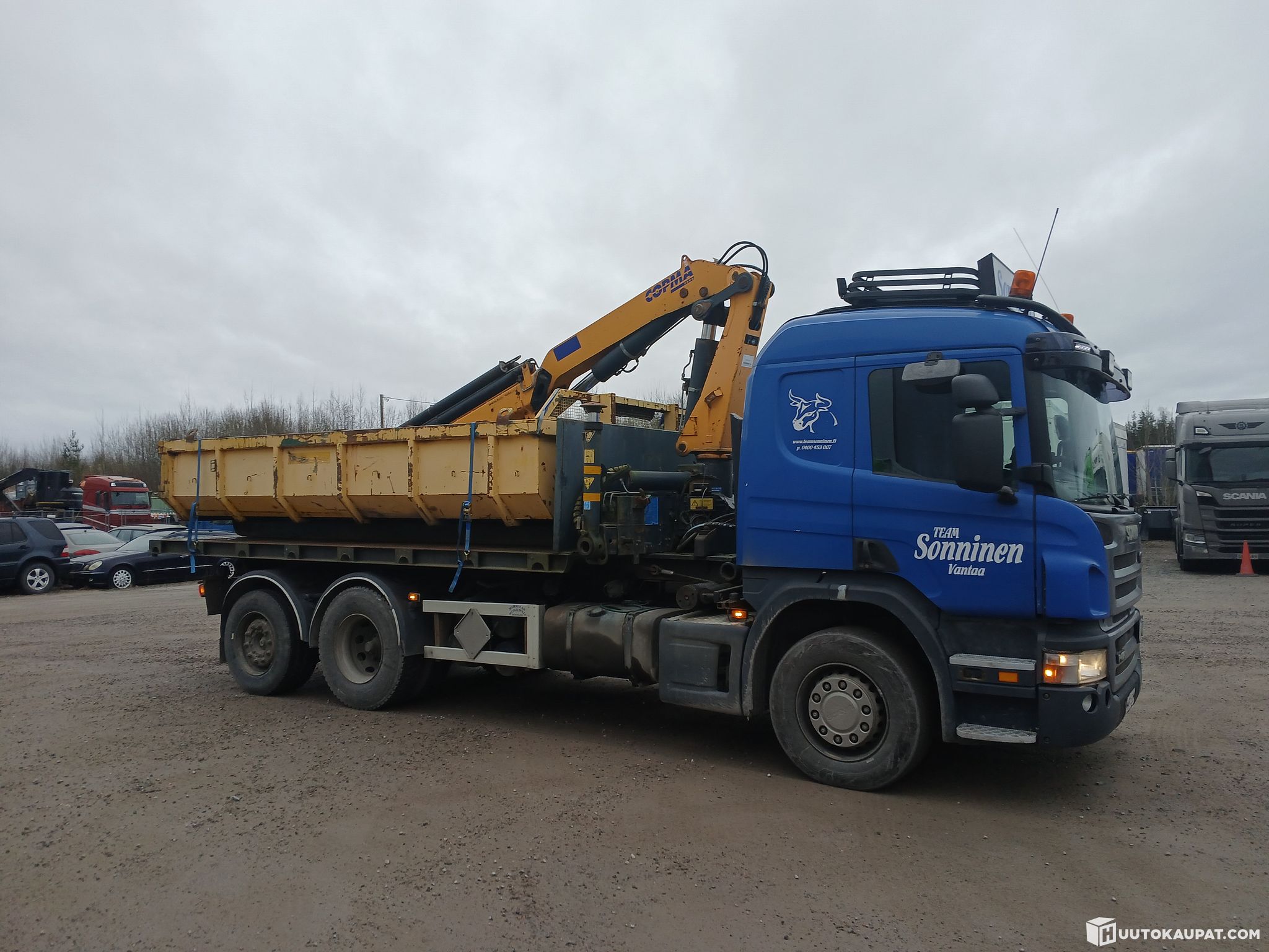 Scania P420 vaihtolava auto vaijerilaitteilla. Auton mukana tulee toimiva Hiab-lavetti n.5metrin lavetilla ja n.4metrin maalava. Autossa mm. kääntyvä telipyörä, hyvät renkaat, vetokita. Autossa havaittu pientä öljyvuotoa mutta ei ole hommia haitannut. Ajotietokone herjaa jarrupaloista mutta edellisessä katsastuksessa ei ollut huomautettavaa.