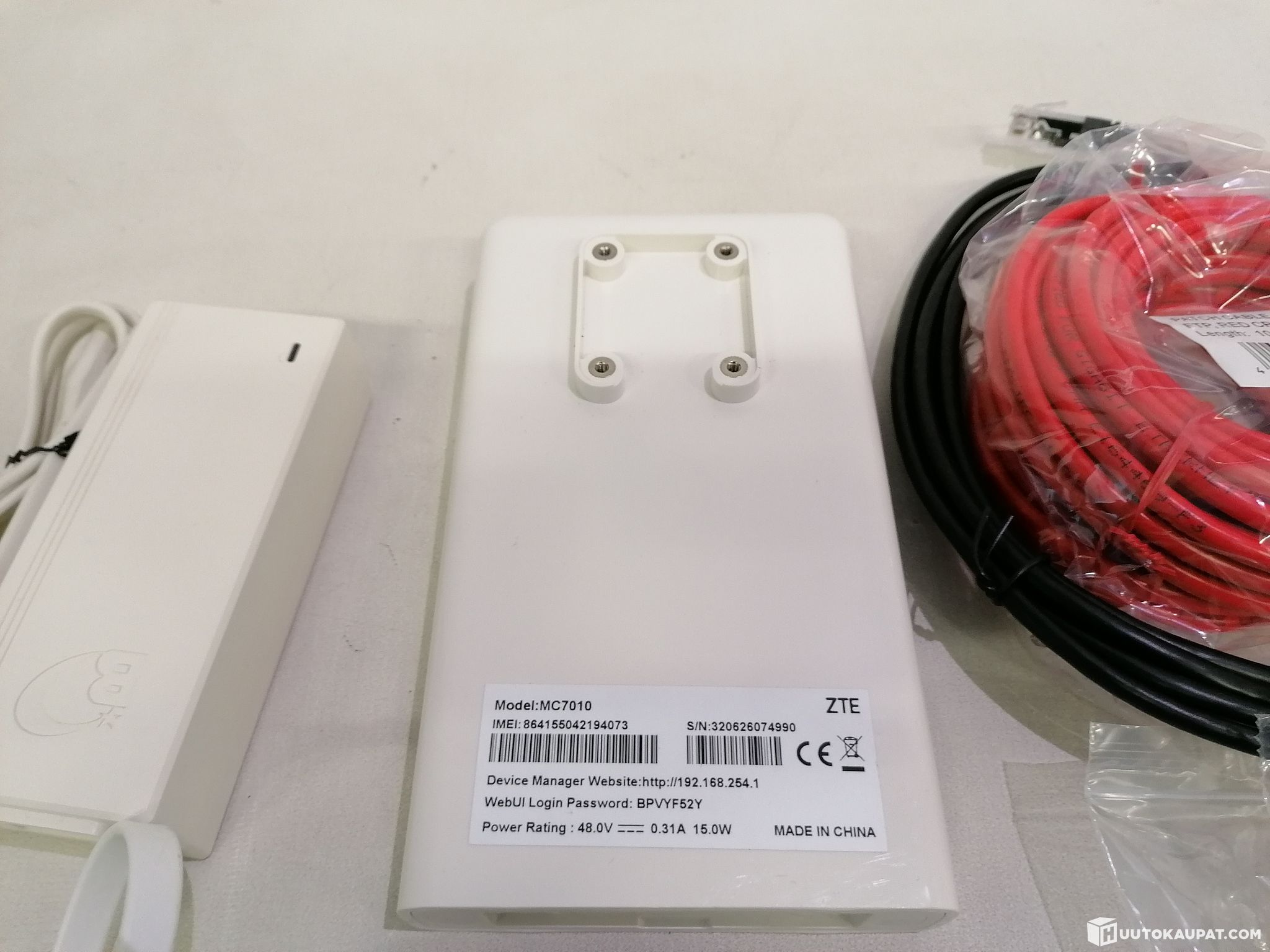 Reitittimen mukana tulee seinäkiinnike, Lattakaapeli - laitteen pohjaan, kiinnitysruuvit, metalliklemmari, pitkä ethernetkaapeli (10metrinen), toinen lyhyt ethernetkaapeli sisälle, tiiviste lattakaapelin ja ethernetin väliin, PoE kytkin, sekä siihen virtapiuha.