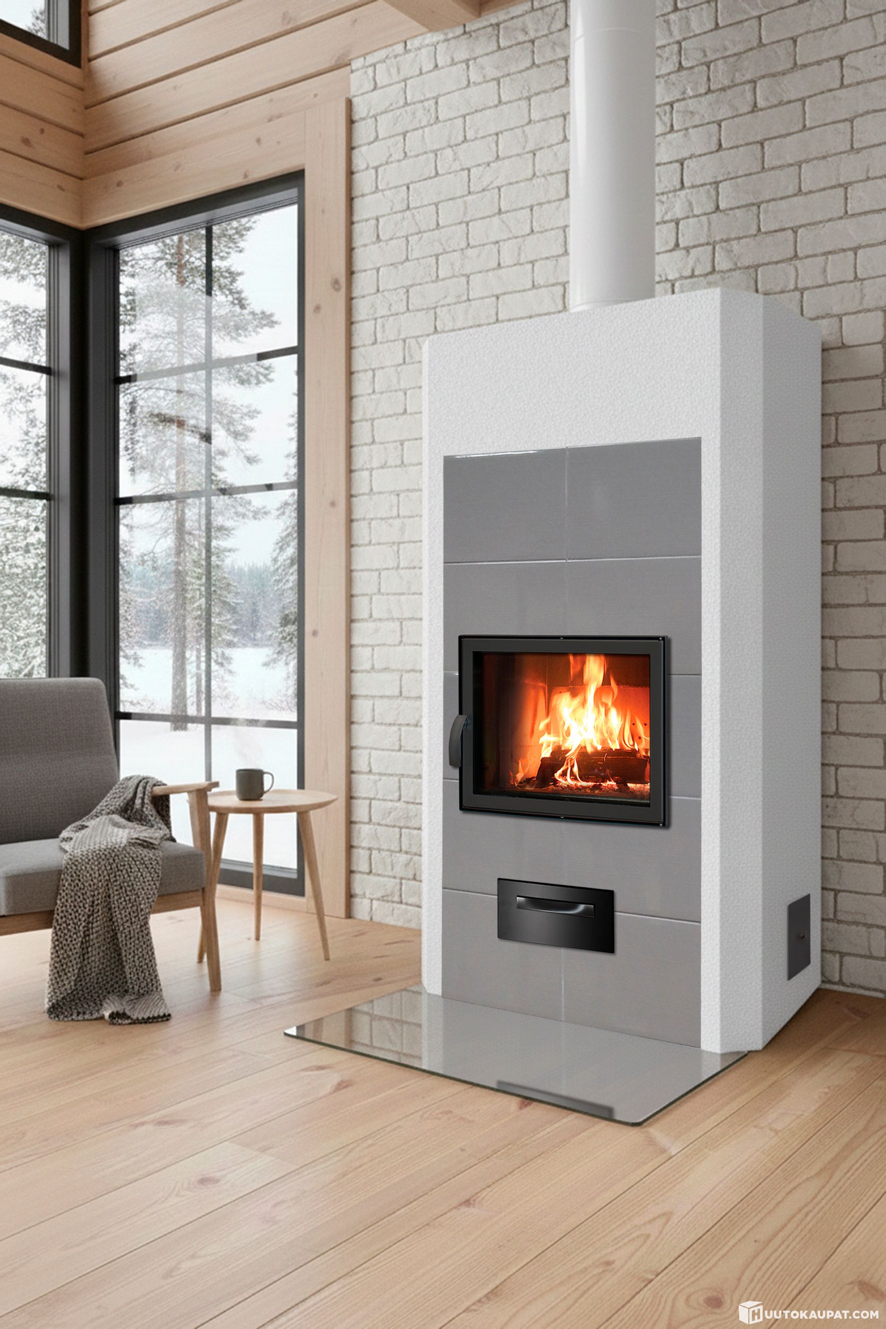 Varaava takka Valkea 100 Basic teräsluukulla ja etupinnan laatoituksella (tarvikepaketti ilman asennusta)