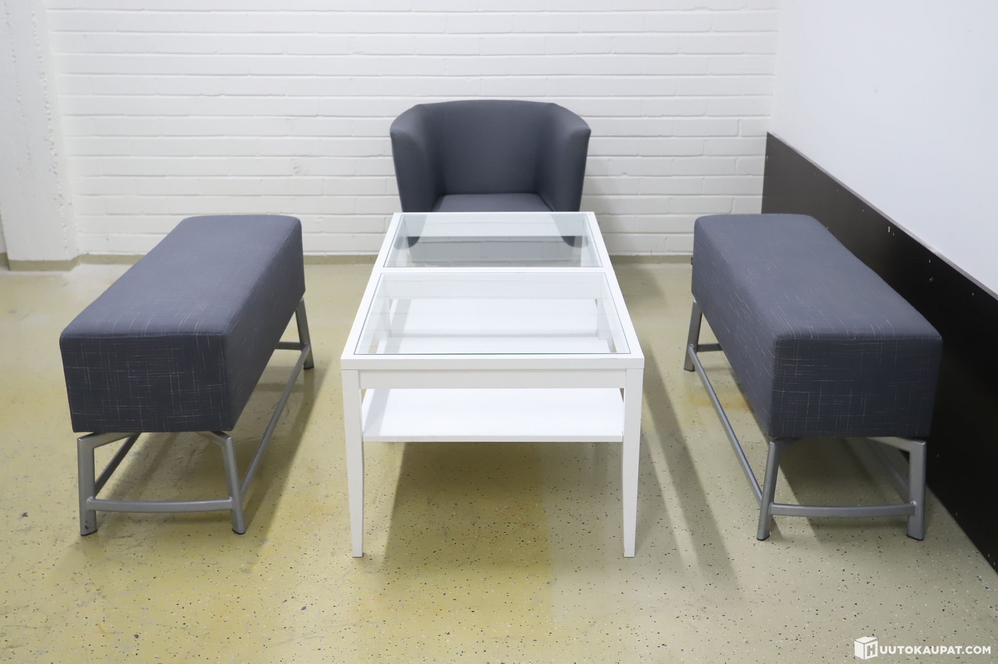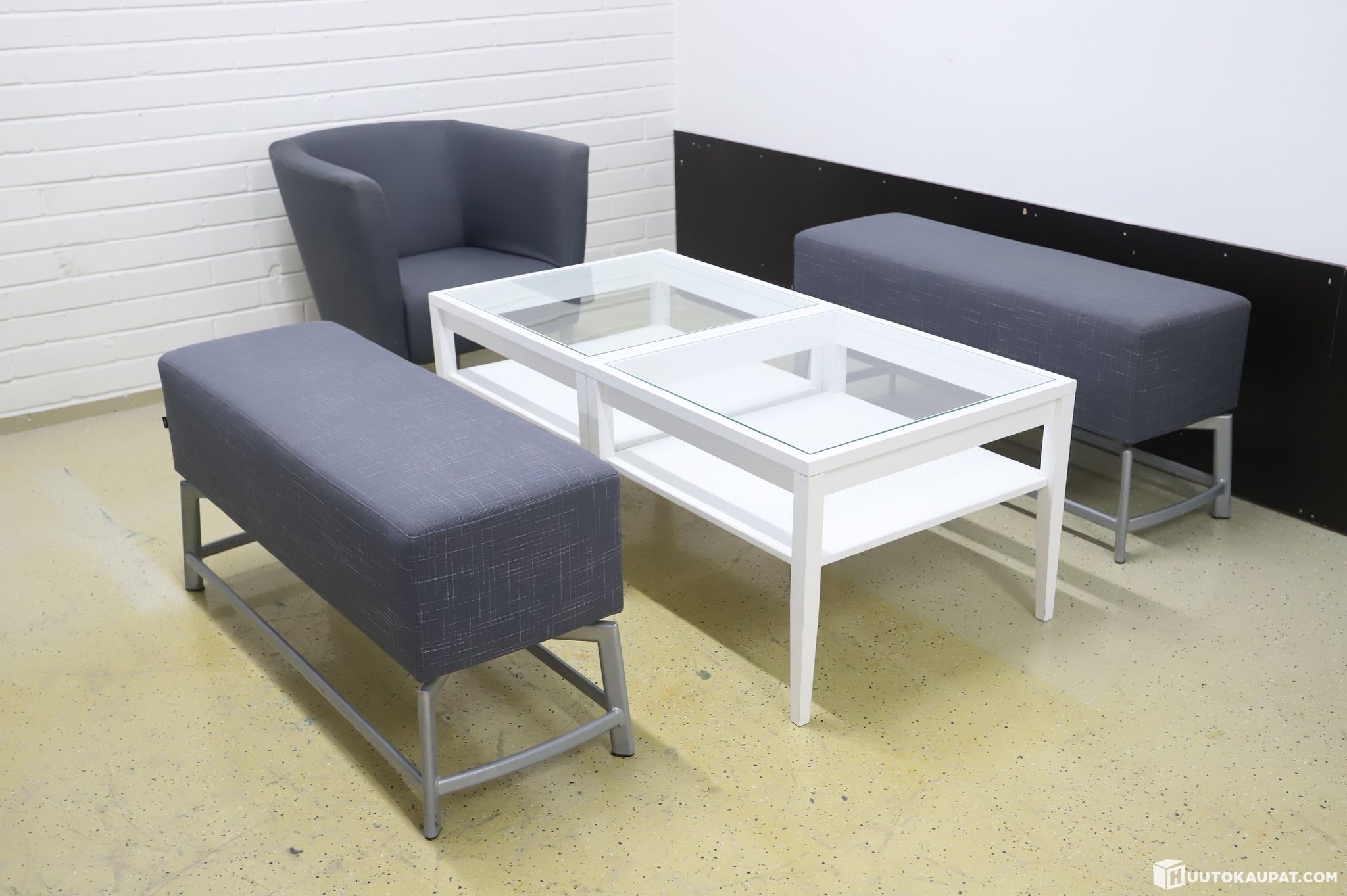Kaksi Selkan verhoiltua penkkiä, nojatuoli ja kaksi lasikantista sohvapöytää.