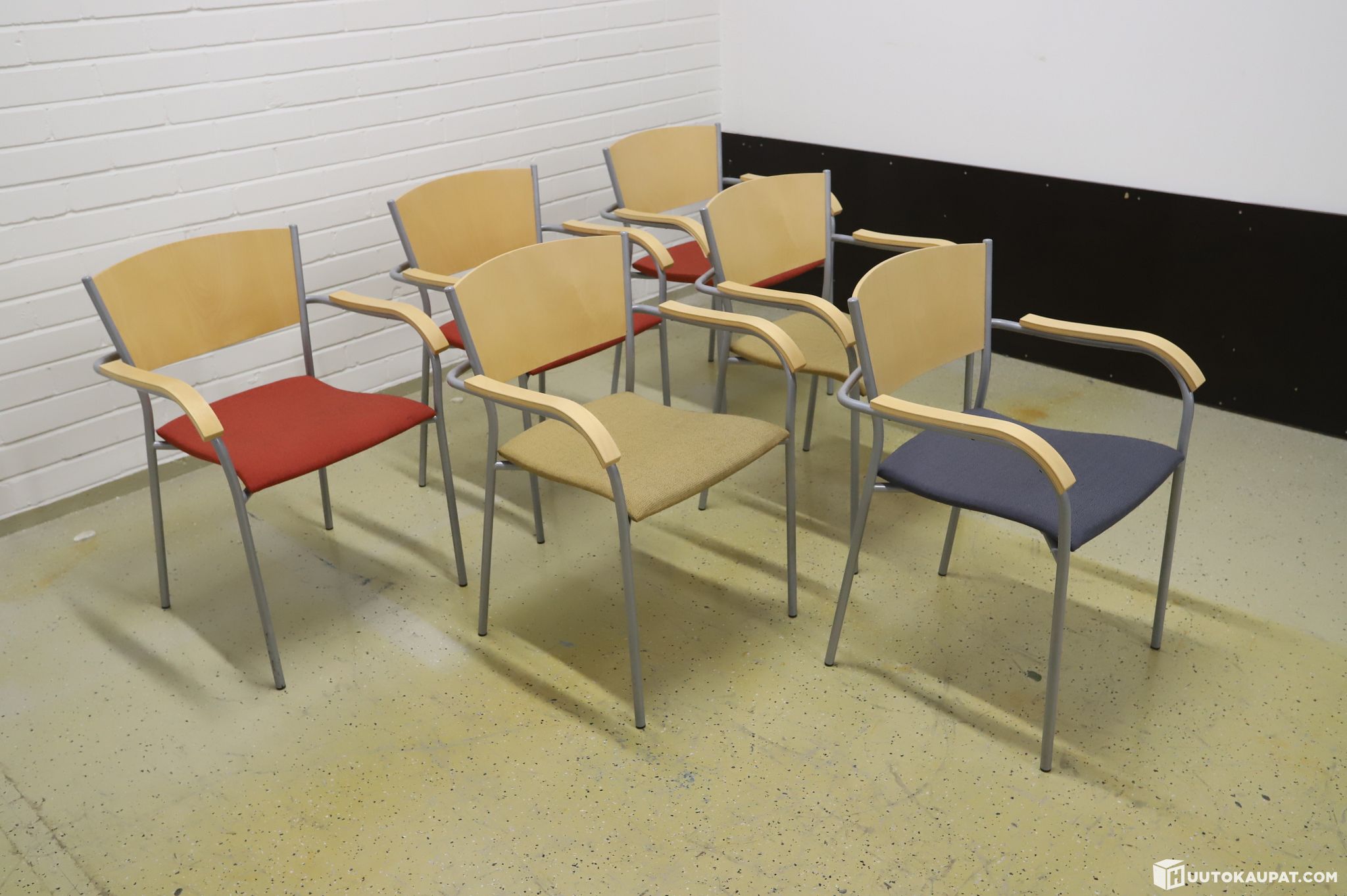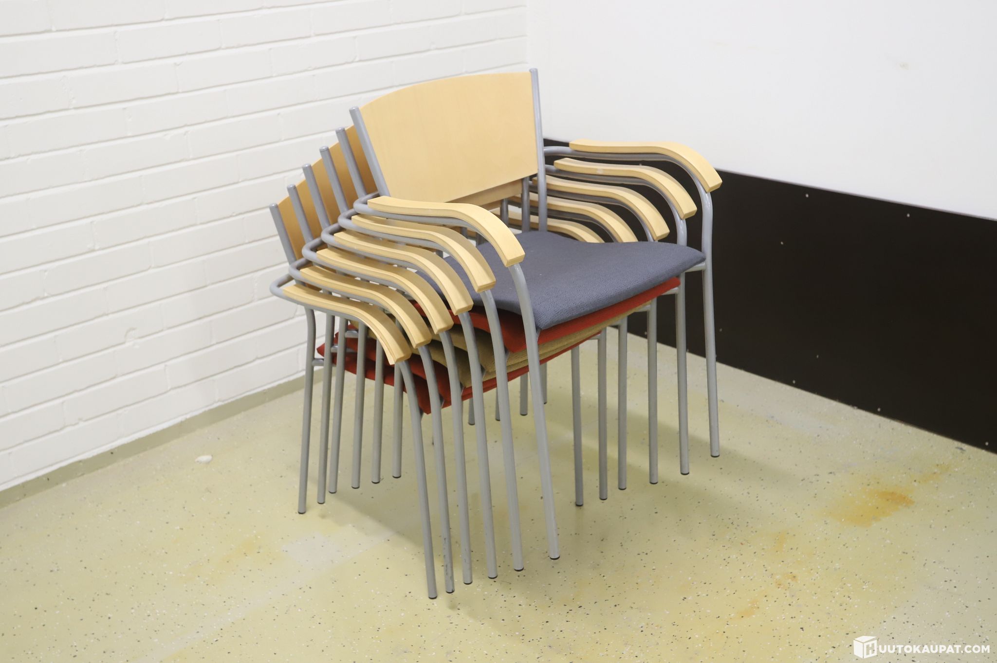 Kuusi laadukkaita kappaletta pinottavia asiakastuoleja käsinojilla.