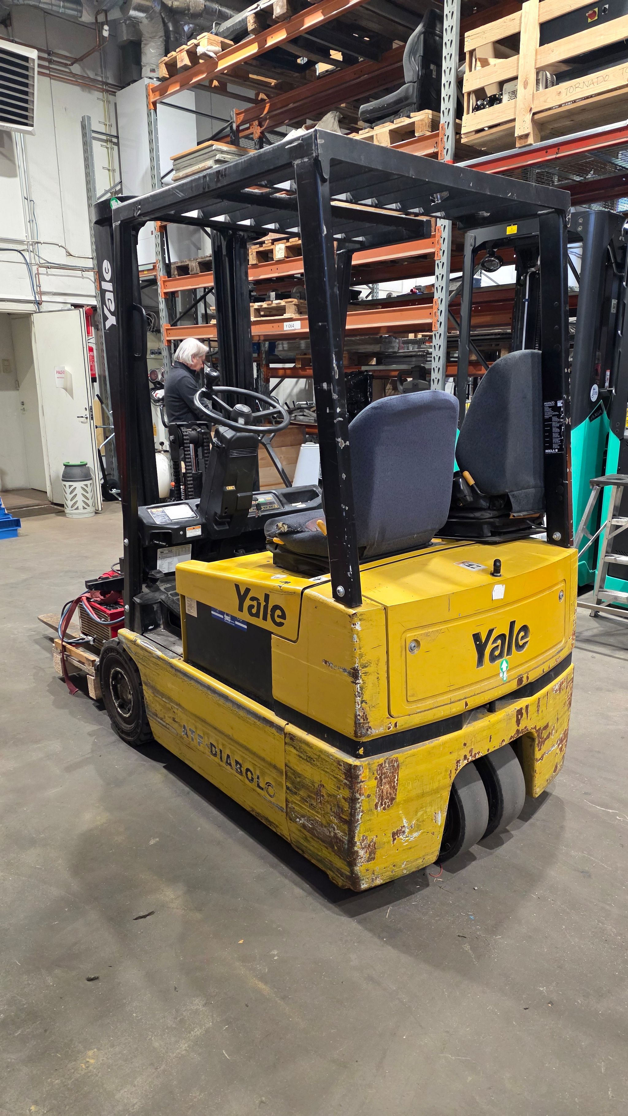 Näppärä henkilönostin helppo kulkea korin mataluuden ansiosta.