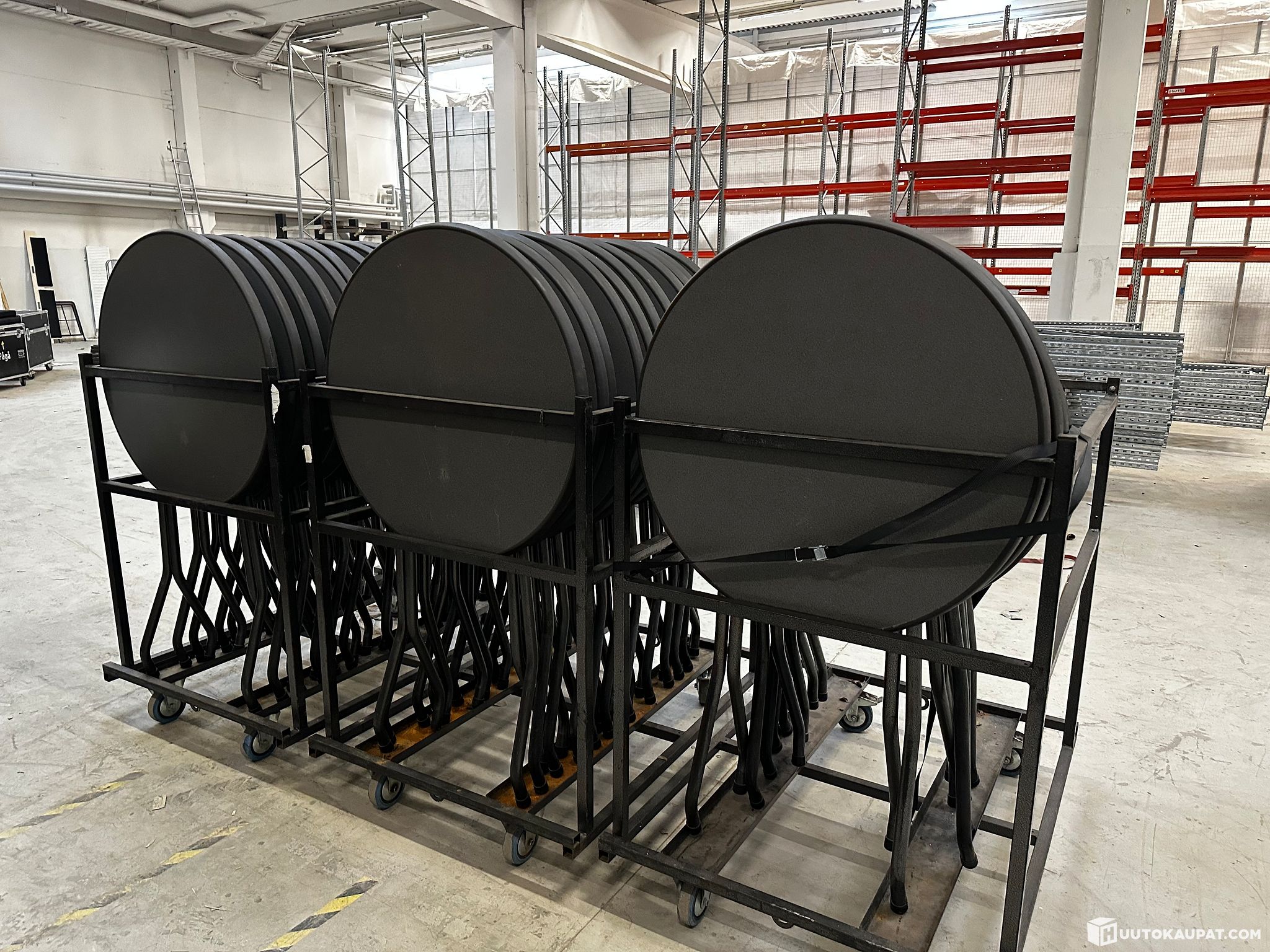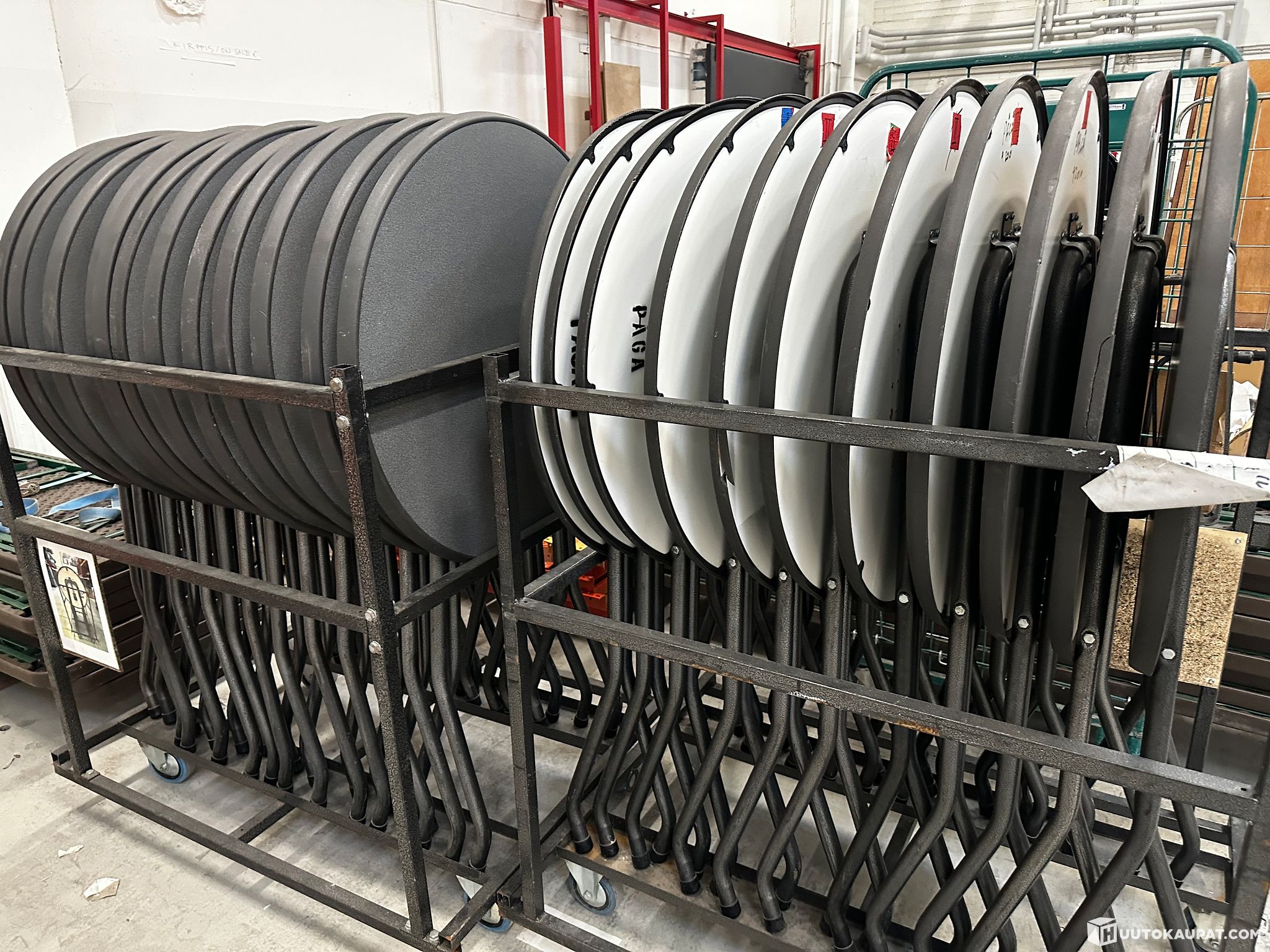 Myydään käytettyjä taittojalkaisia pystypöytiä. Mukaan kuuluu valmistajan kuljetuskärryt joihin saa 12 kpl per kärry. Pöydät ovat olleet pidempään käytössä, mutta toimii edelleen.
