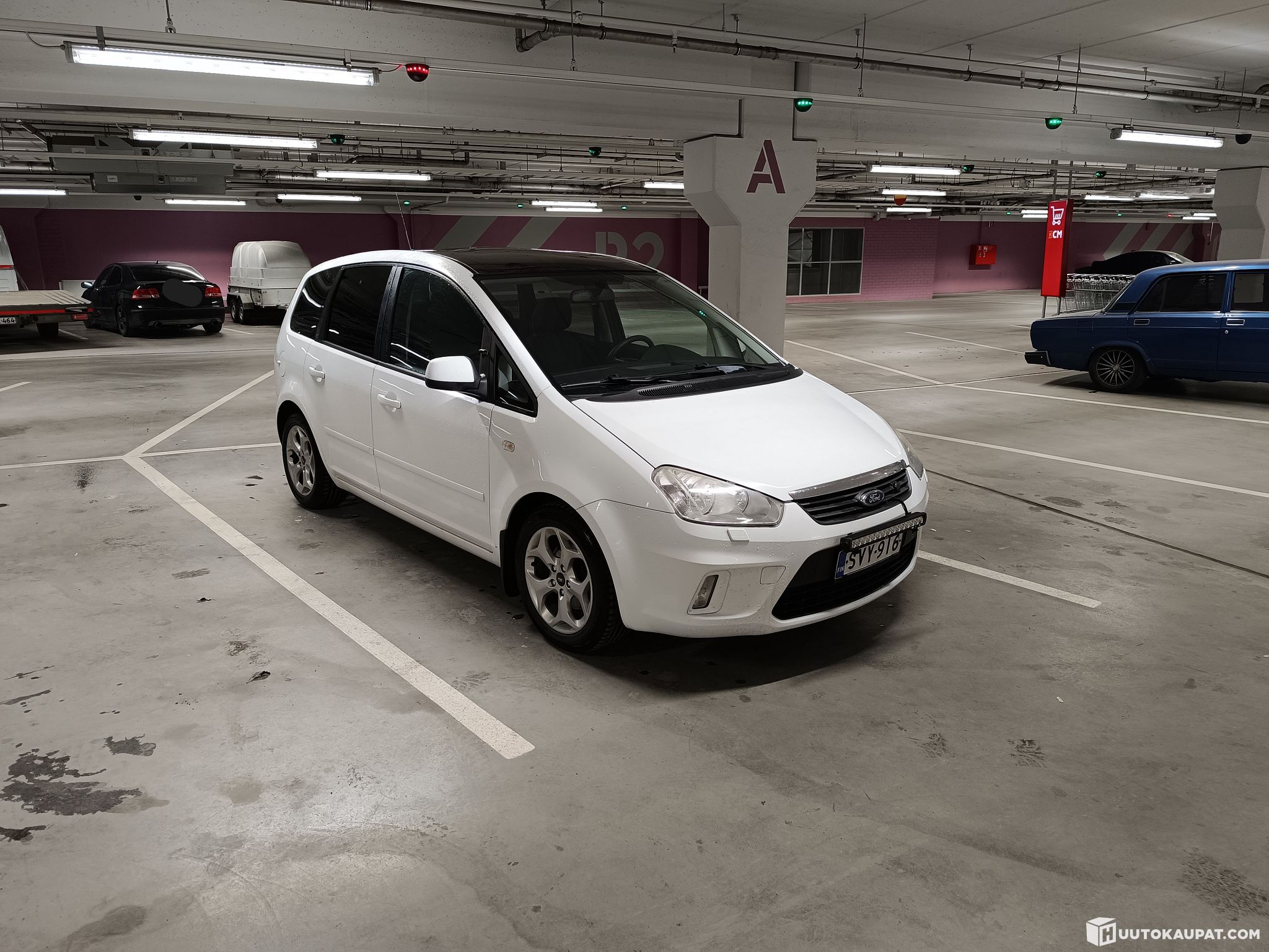 Lisävalo kuuluu hintaan ja valaisee hyvin. Lämmittävä tuulilasi ja panoraamakatto täysin ehjiä.