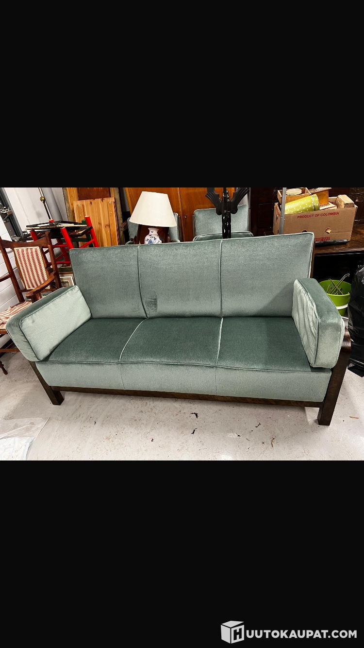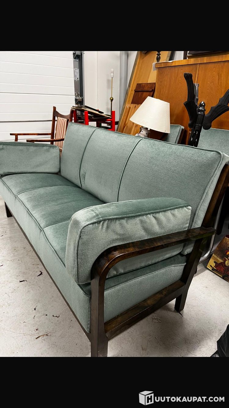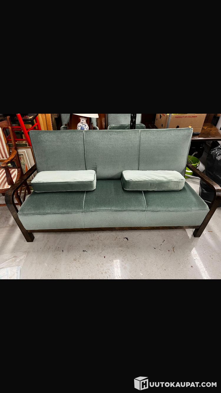 Edustuskodin sohva 1940-luvun funkistyyliä. Tumma alkuperäinen petsi. Sinertävä villaplyysiverhoilu. Tyylikäs kompaktinkokoinen kokonaisuus. Toisessa ilmotuksessa saman sarjan nojatuolit. Pituus 170 cm, syvyys 70, korkeus 84 cm. Hyväkuntoinen. Jousitettu.
