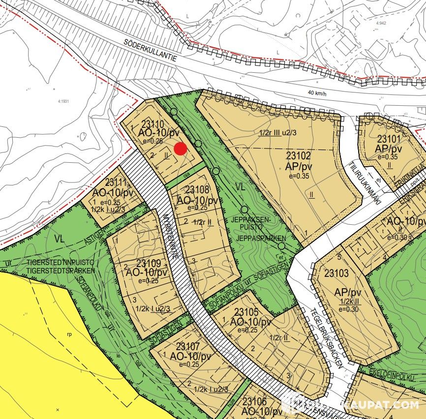 Tontin K23110T2 pinta-ala on 764 m2 ja rakennusoikeus 191 k-m2.