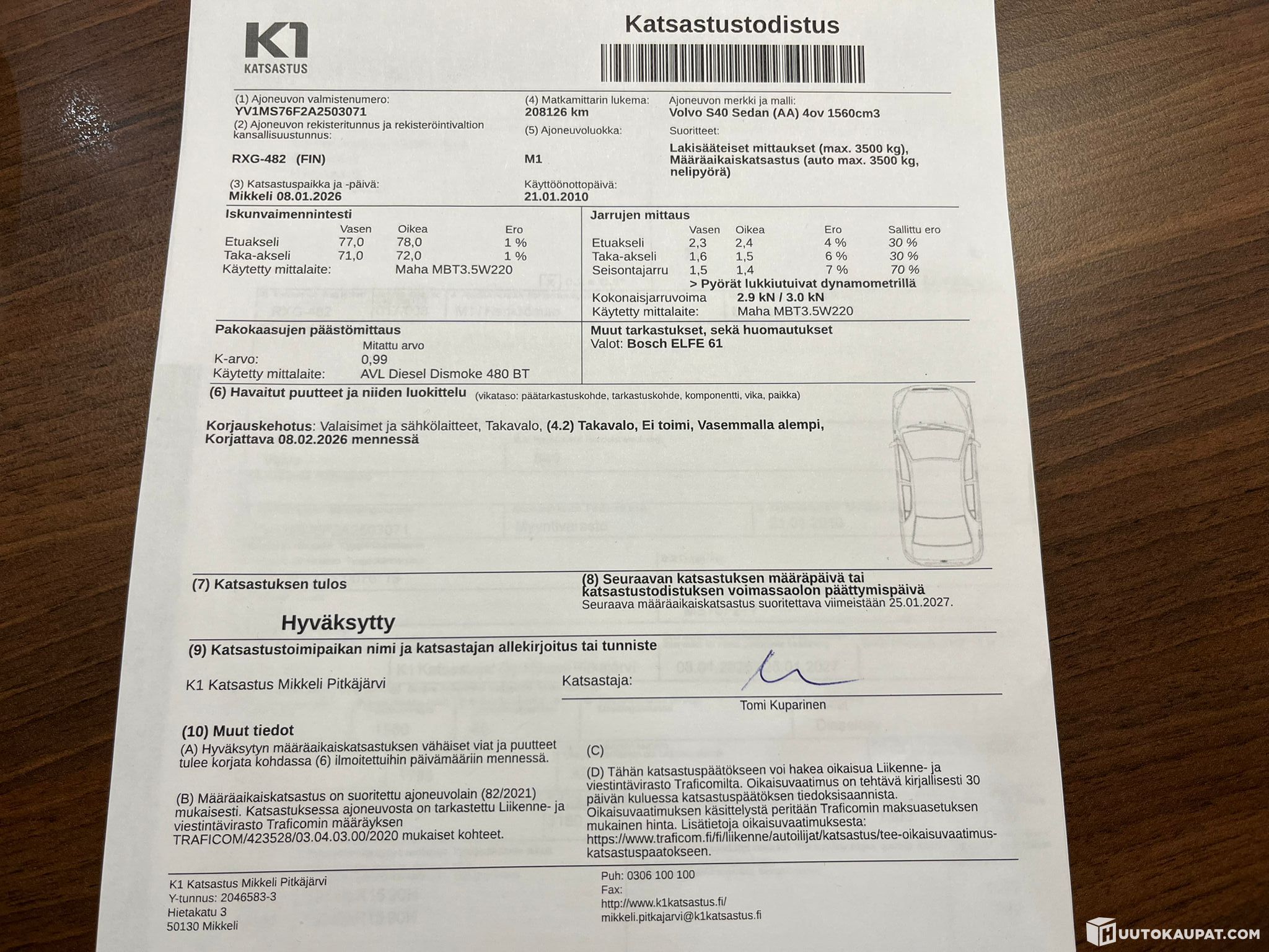 8.1.2026 Määräaikaiskatsastus hyväksytty (208 126 km)