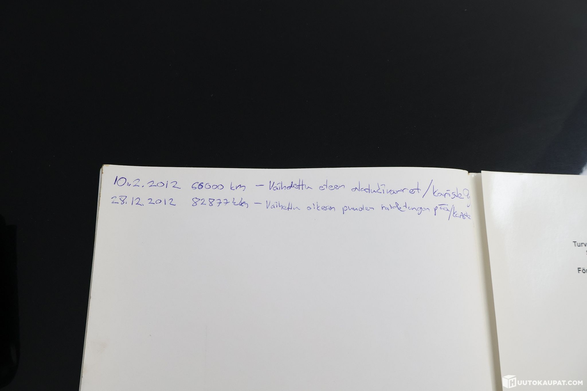 - Vauriot ja huoltokirja kuvissa.