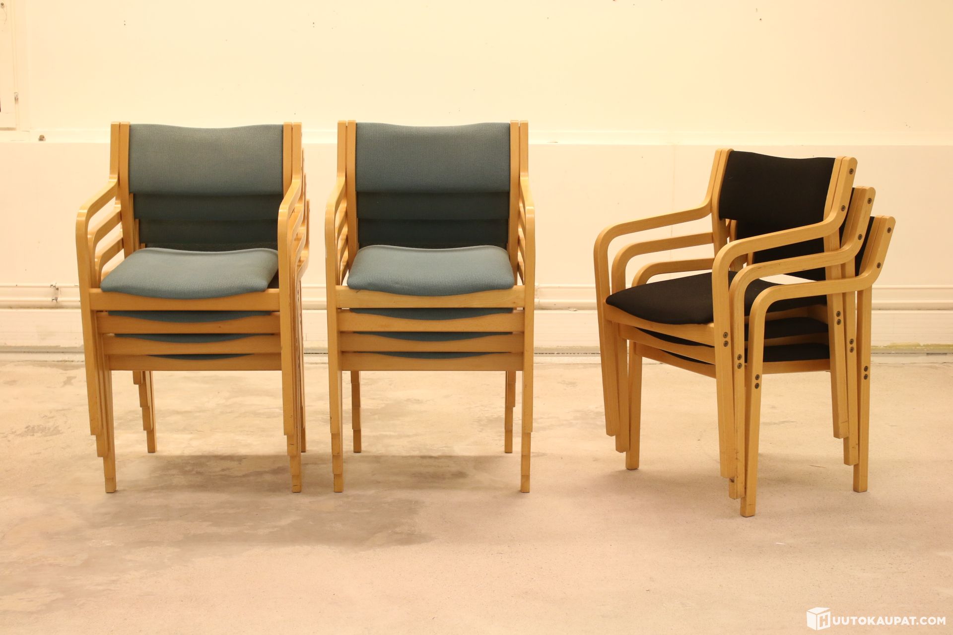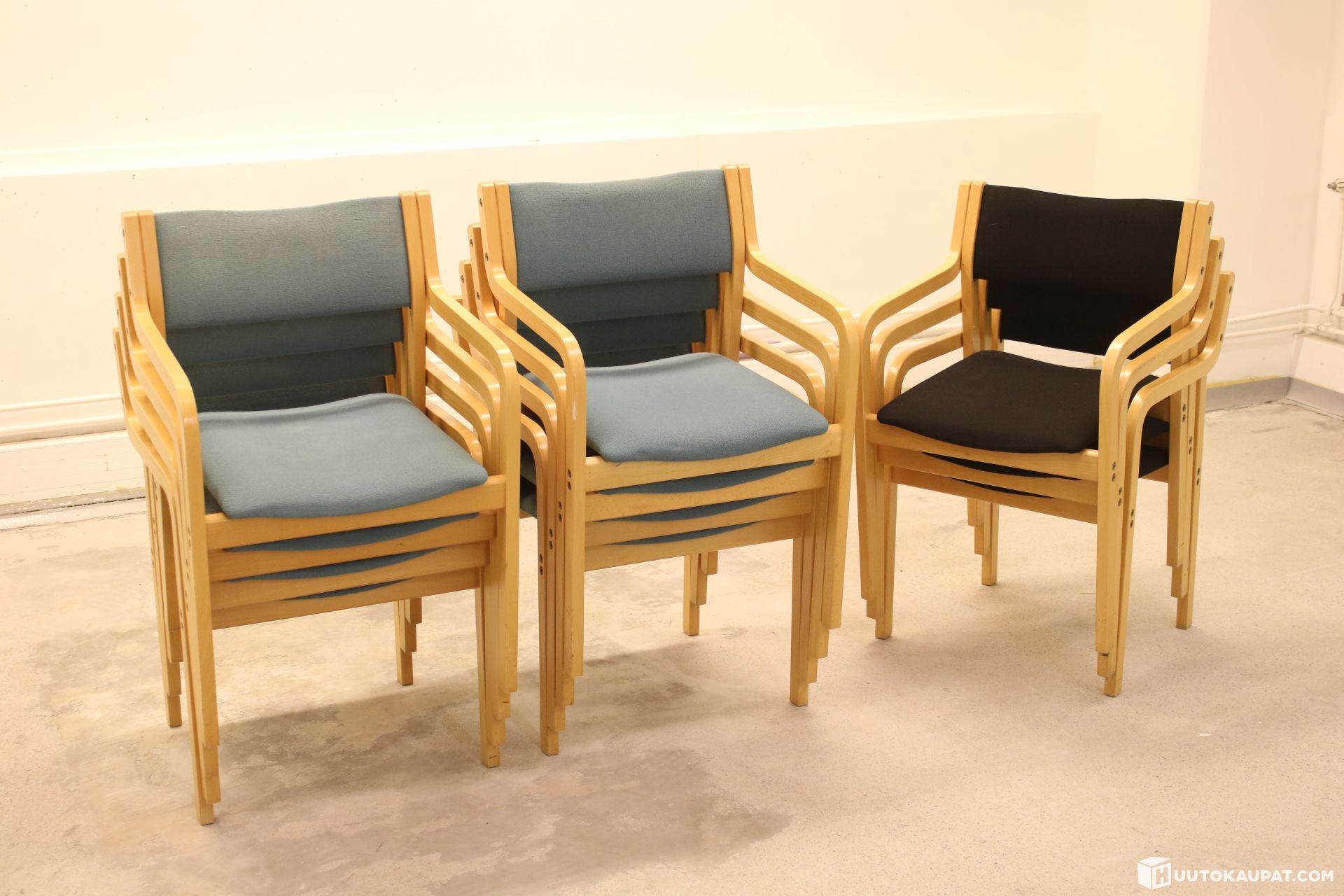 11 kappaletta Martelan klassikko tuoleja. Malli: Kari. Kahdeksan kappaletta sinisiä ja kolme kappaletta mustia tuoleja.