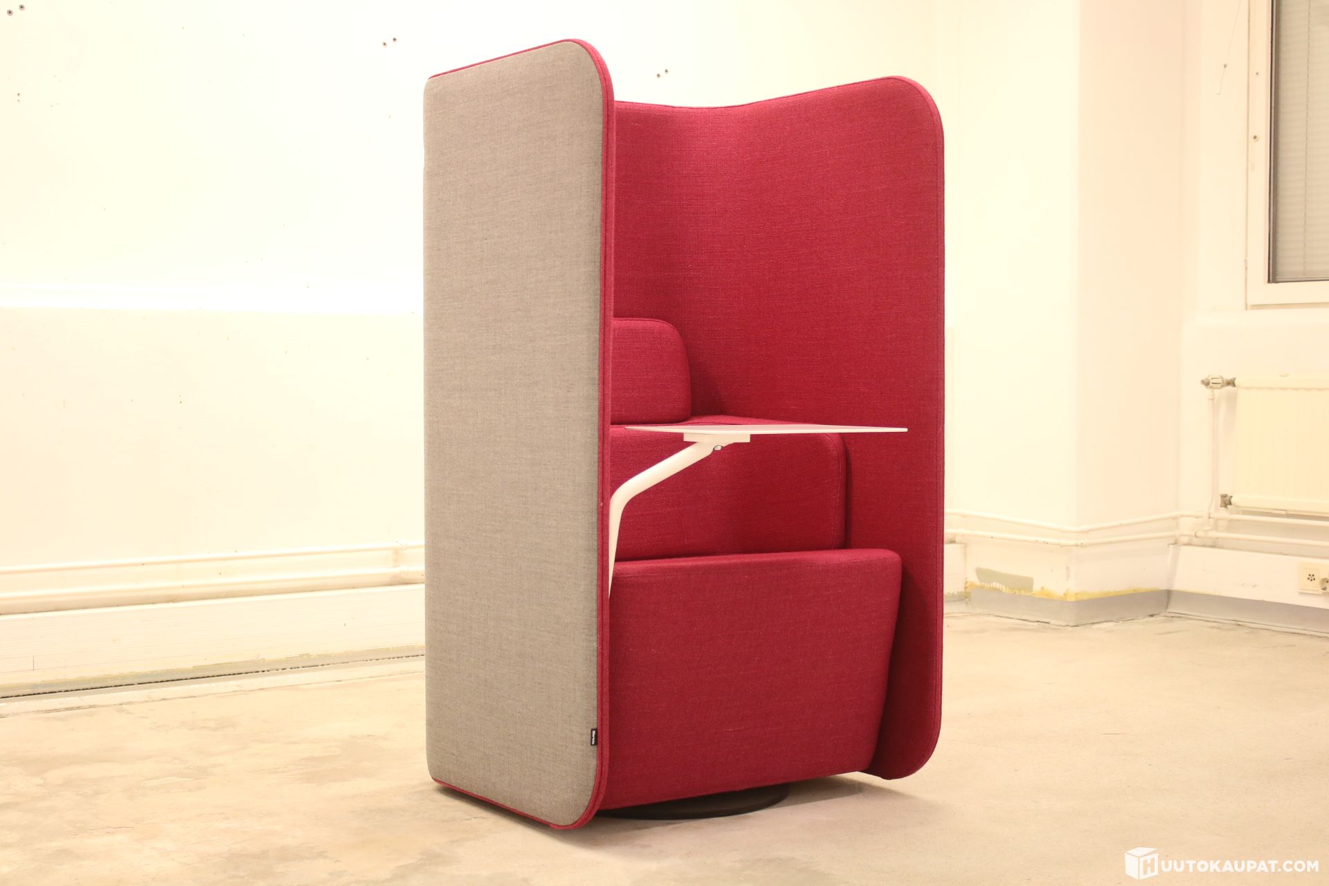 Martelan PodSeat on moderni akustoiva nojatuoli, joka tarjoaa yksityisen ja rauhallisen paikan työskentelyyn, puheluihin tai keskittymiseen. Korkeat selkä- ja sivuseinät vaimentavat ääntä ja luovat suojaa avotoimistossa. Mukana kätevä valkoinen pöytätaso, joka soveltuu erinomaisesti esimerkiksi läppärille tai muistiinpanoille. Pyörivä laippajalka. Sisäpuolen verhoilu lila Hallindgal.