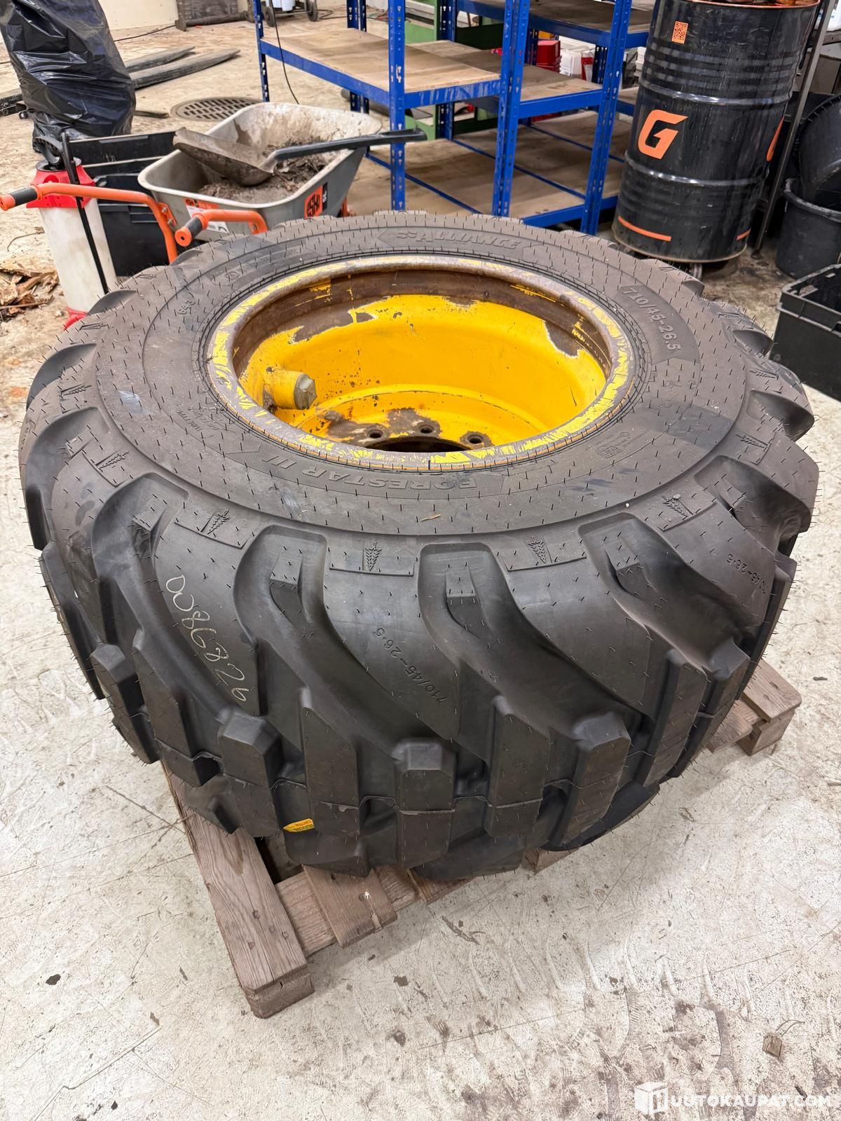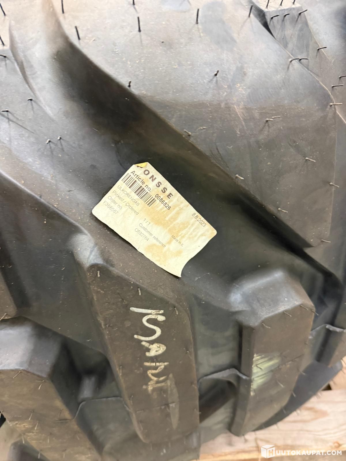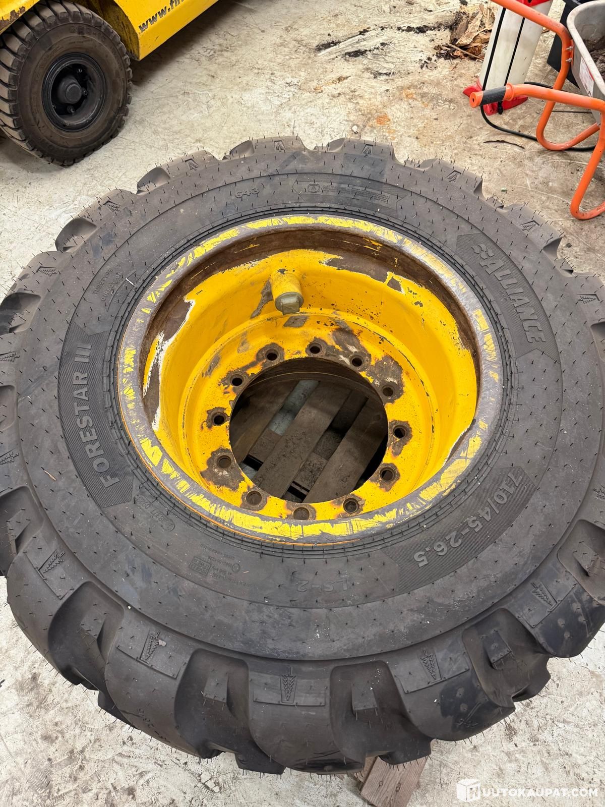 Myydään varapyöränä pidetty täydellinen metsäkoneen pyörä. Käytetty Ponssen vanne + uusi sisärengas + uusi Alliance 643 Forestar III rengas. Koko 710/45-26.5.