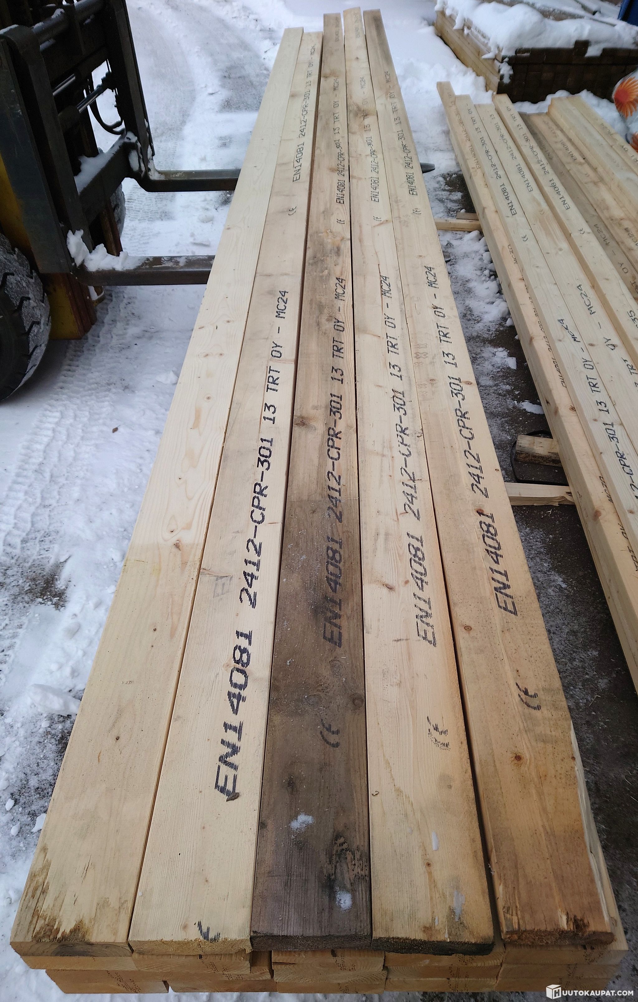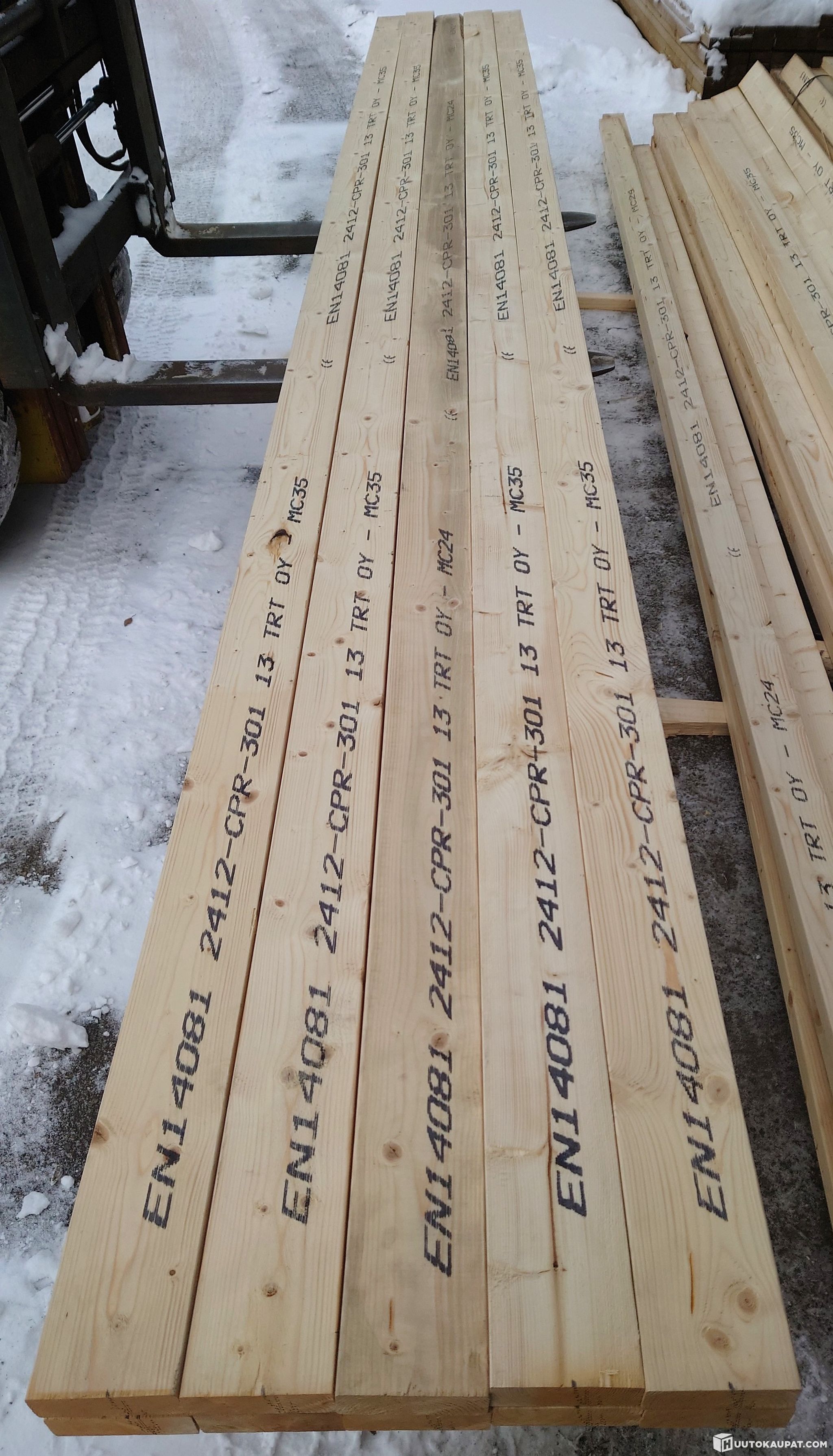 Kuvissa esitelty 141,6 m erä mitallistettua koneellisesti lujuuslajiteltua ja CE-merkittyä kuusilankkua 42120 mm. Pituudet ja laatu: 16 kpl a' 5,4 m MC 35, 6 kpl a' 6 m MC 24, 2x 4,8 m 1x 5,1,ja 4,5 m MC 24. Kolme lankkua on leimaamatonta. Muutama lankku on UV-säteilyn ja varastopölyn tummentama, mikä ei käyttöä haittaa.