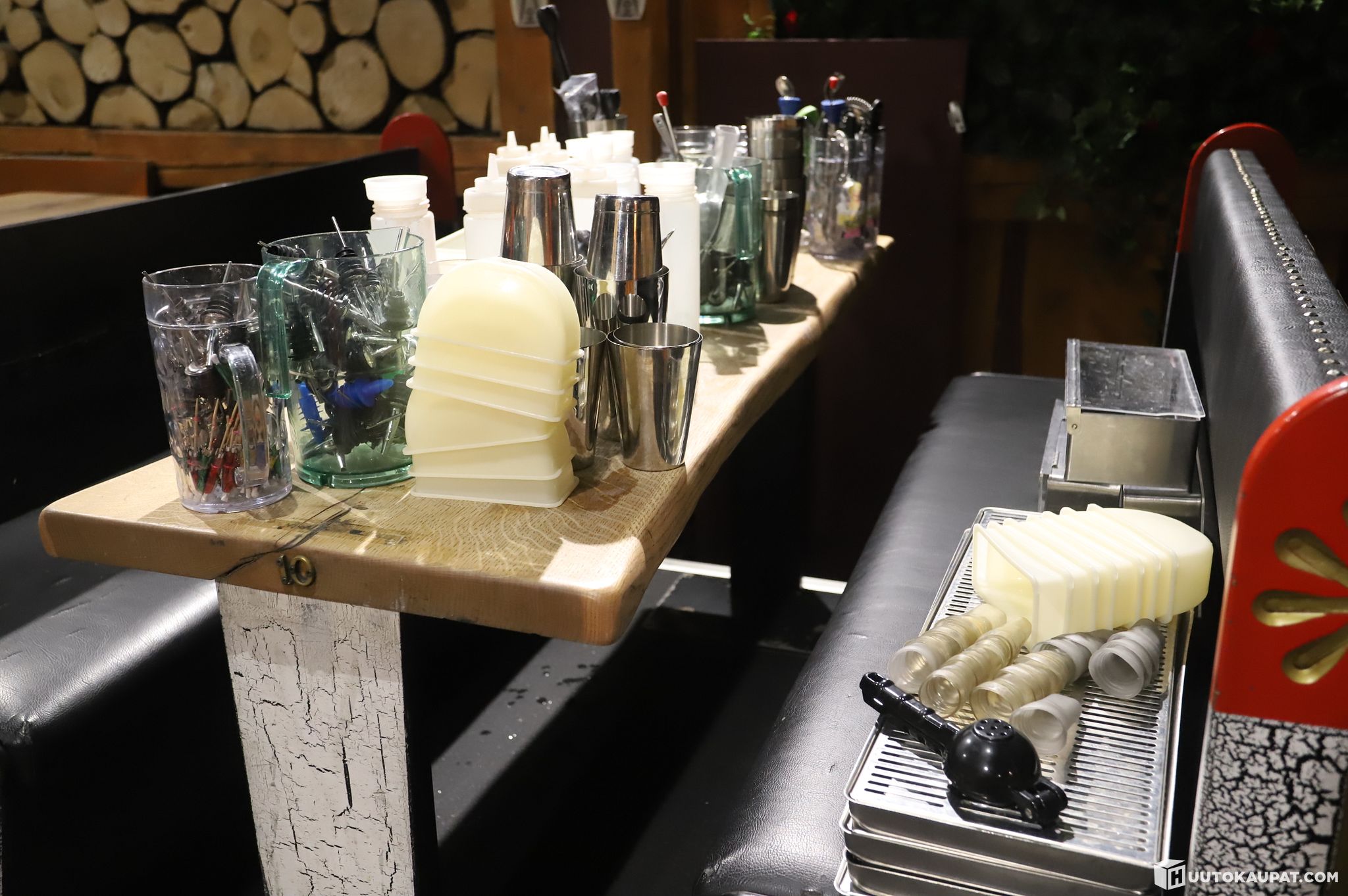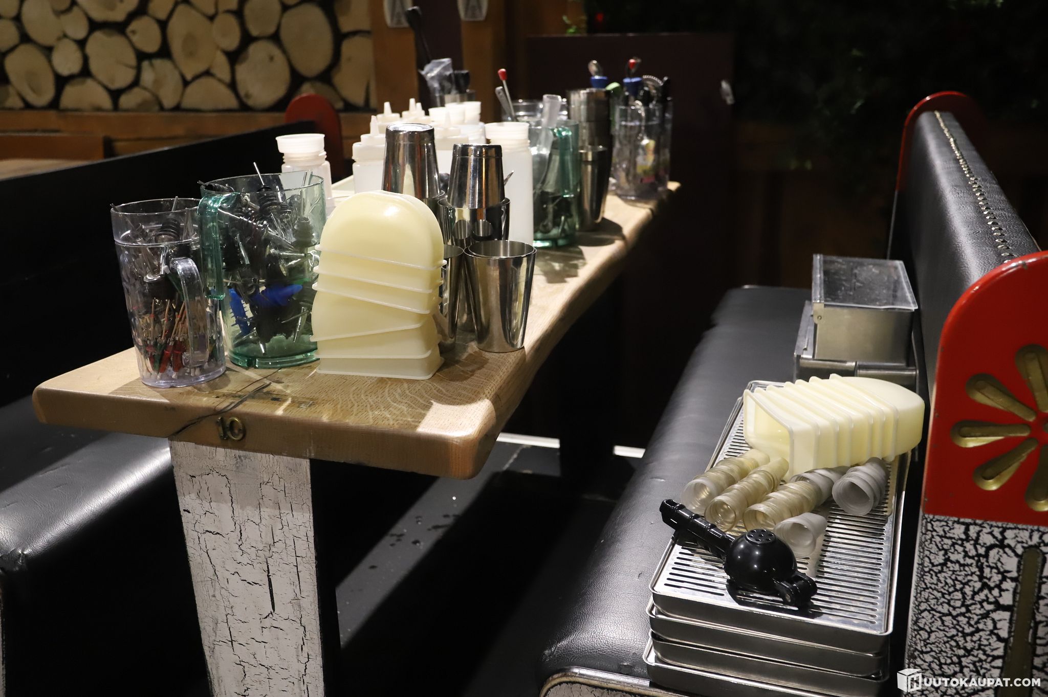 Kaksi pöydällistä baarimestarin työkaluja / tarvikkeita.