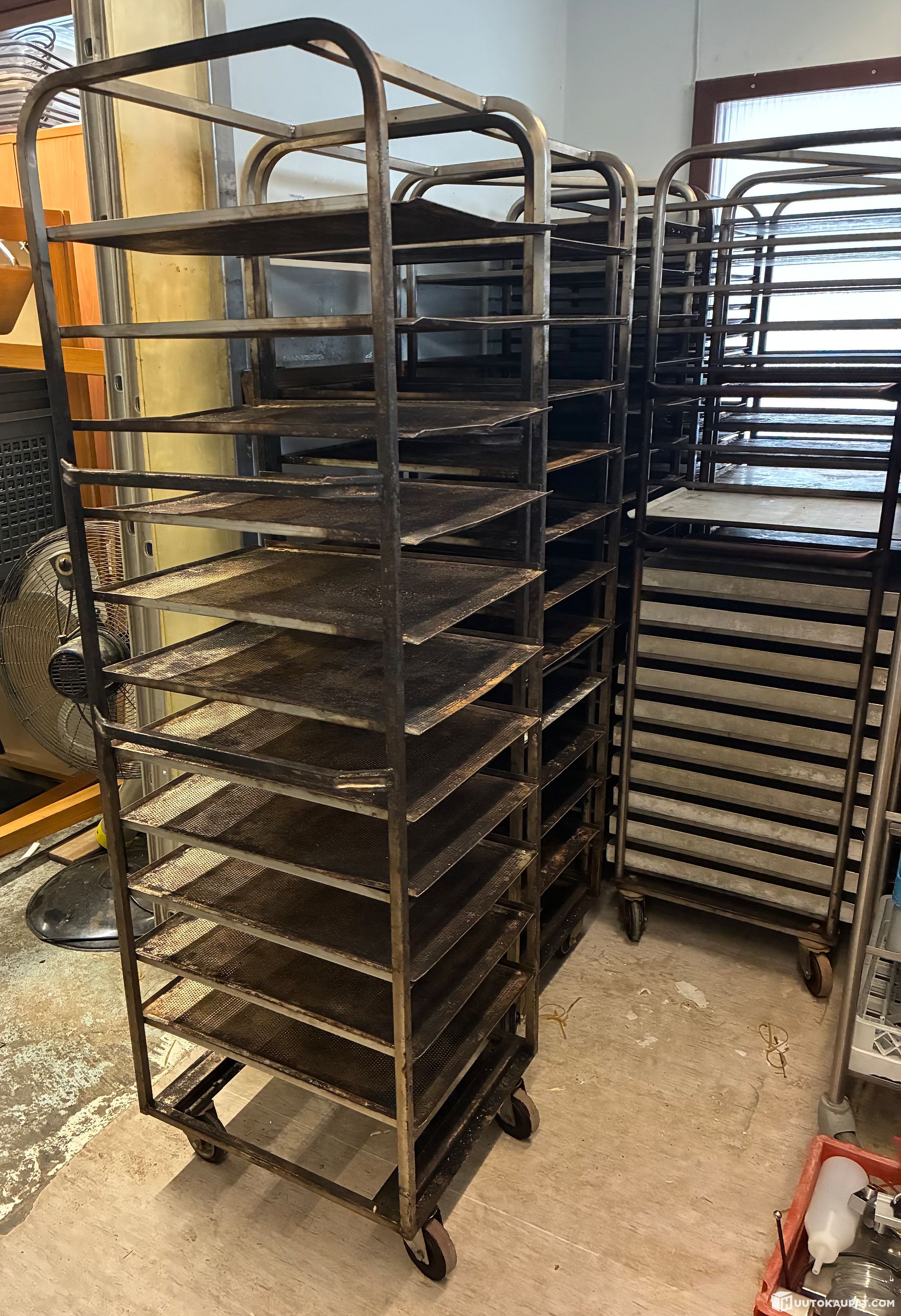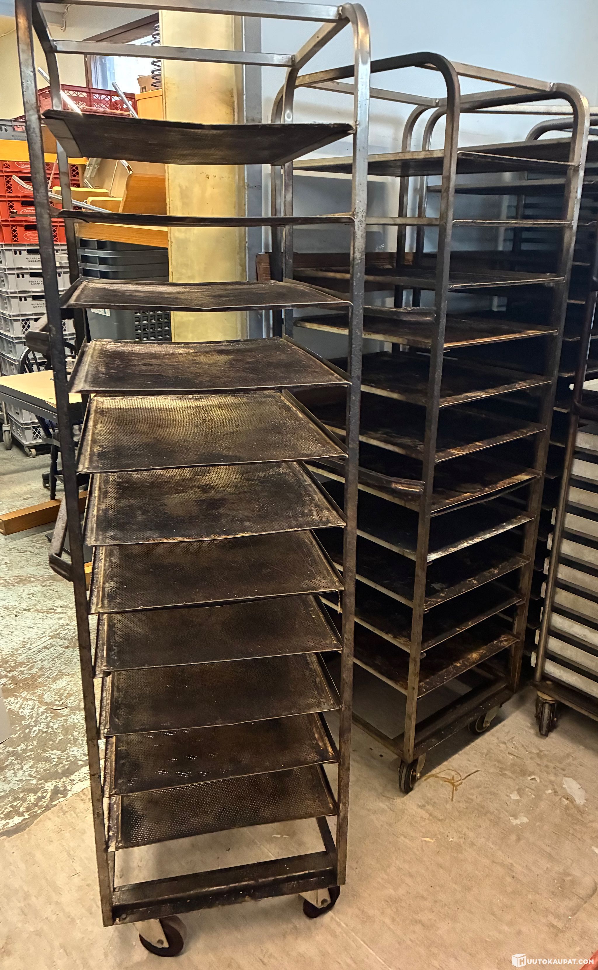 Pinna-uunivaunuja 8 kpl paistopelteineen. Lämmönkestävillä pyörillä leipomokäyttöön.