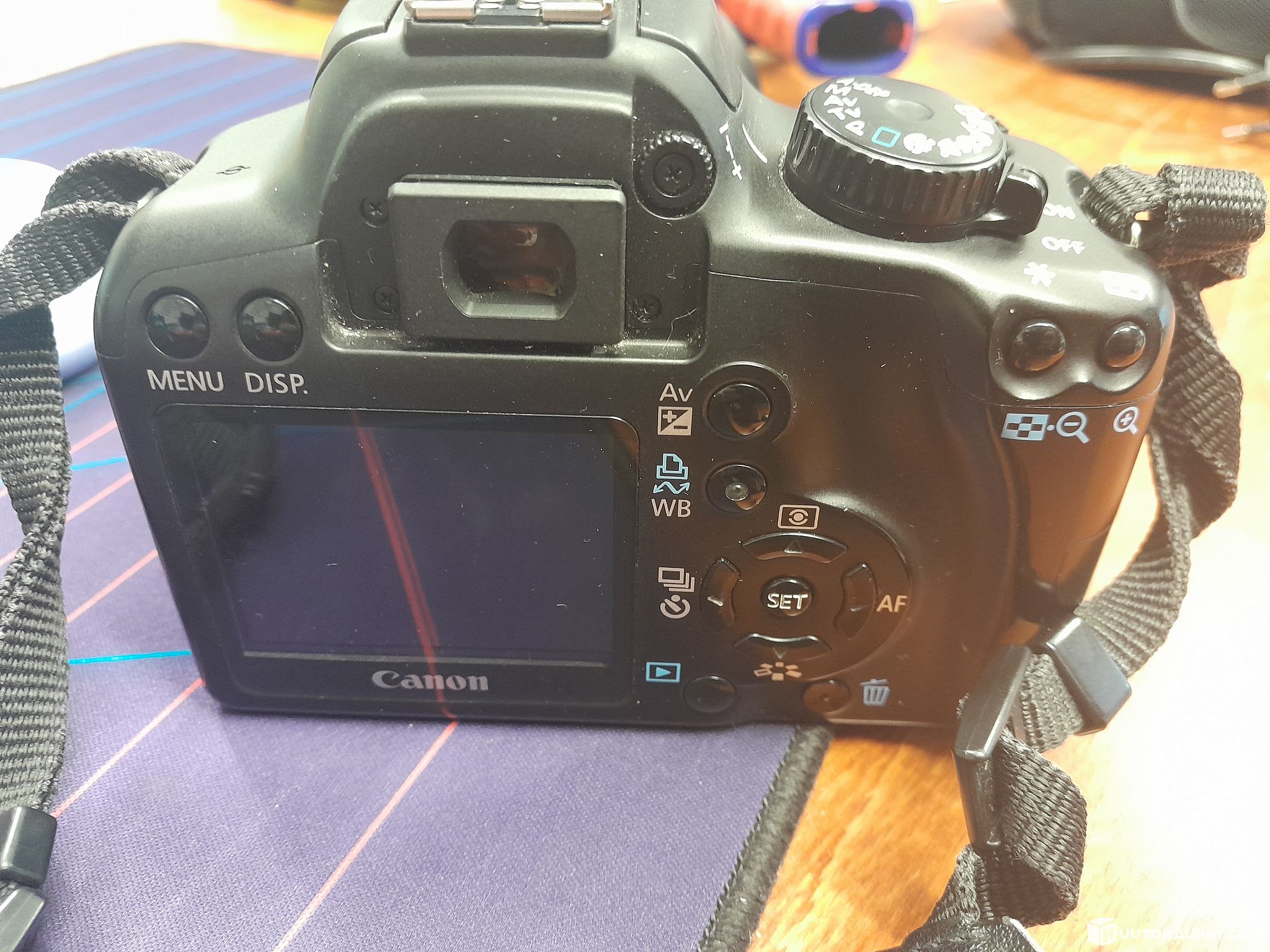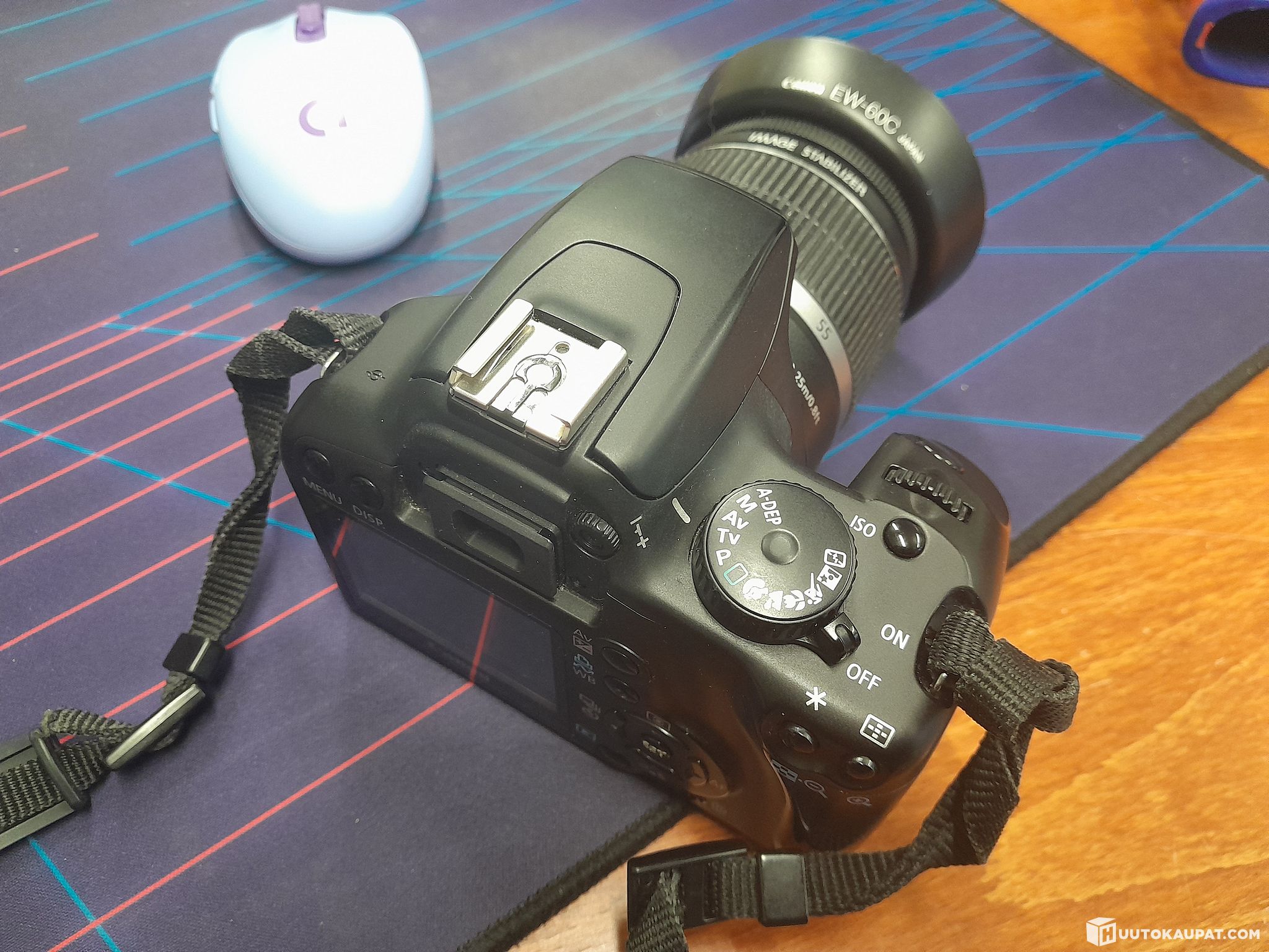 Käytetty mutta toimiva. Mukana suojalaukku, 1 akku, laturi, EFS 18-55mm objektiivi, EW-60C vastavalosuoja ja linssisuojus. Vasemman sivun liittimien suojaläppä puuttuu.