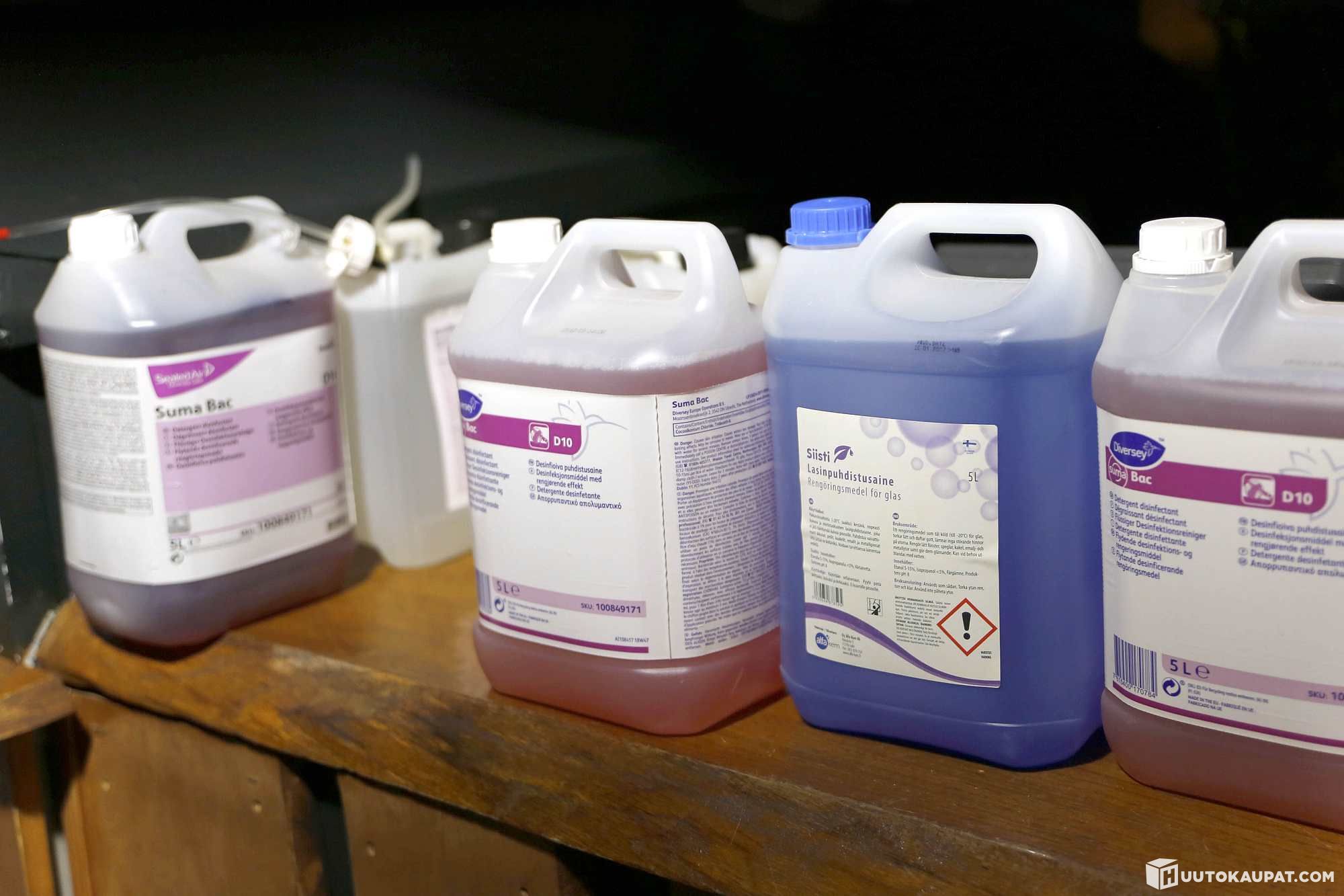 Erä pesuaineita ja savunesteitä. Yhteensä 16 kanisteria/astiaa