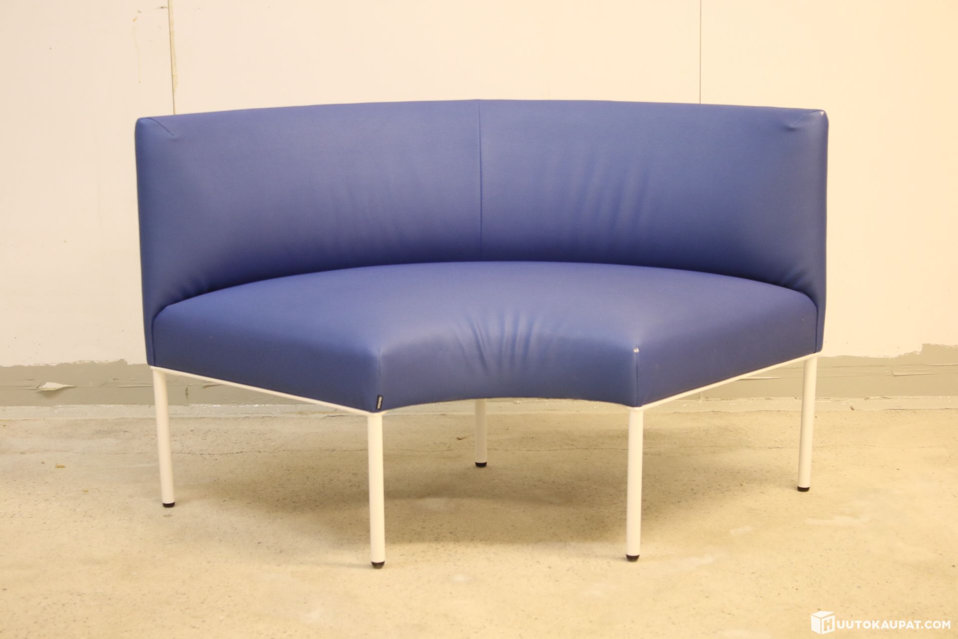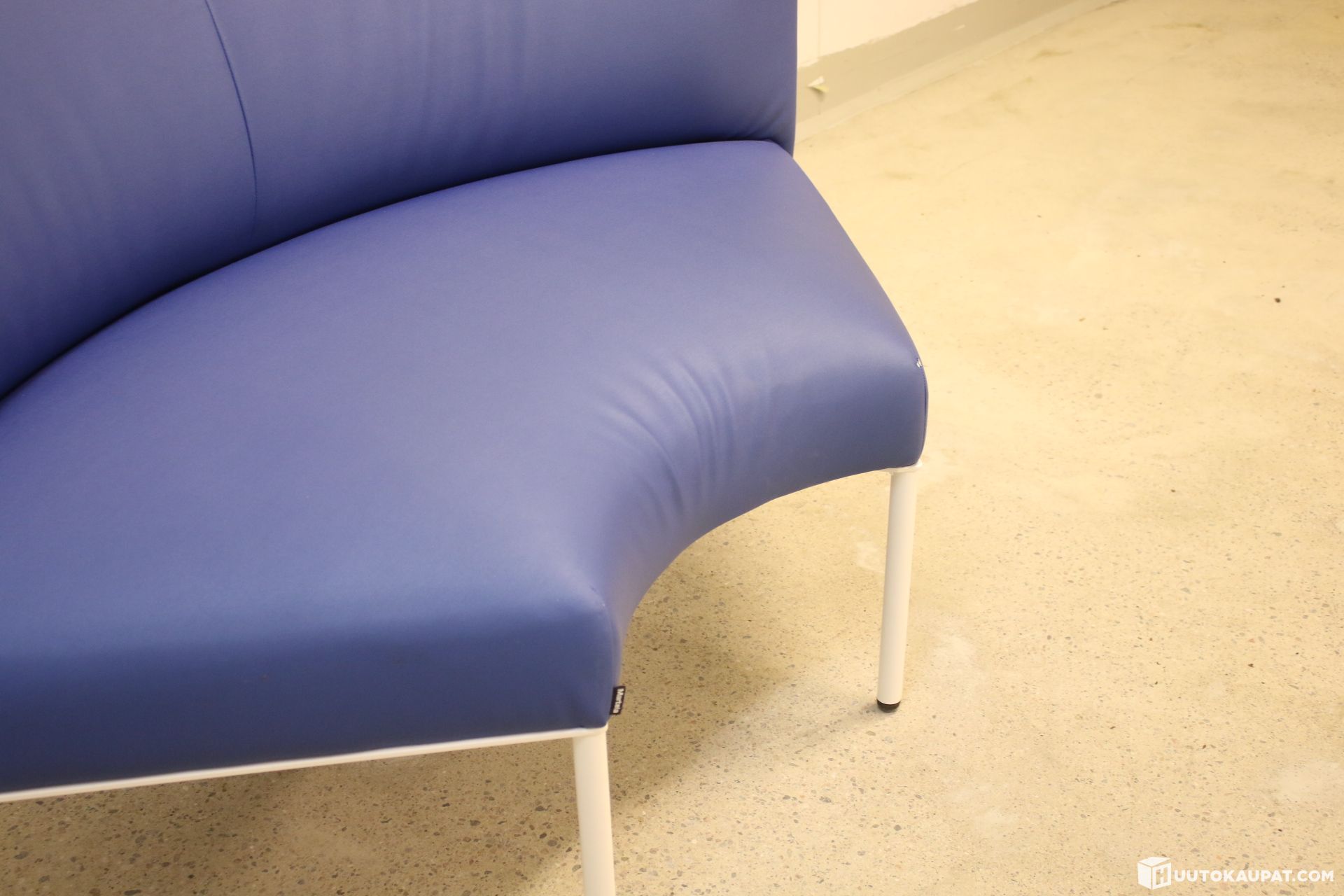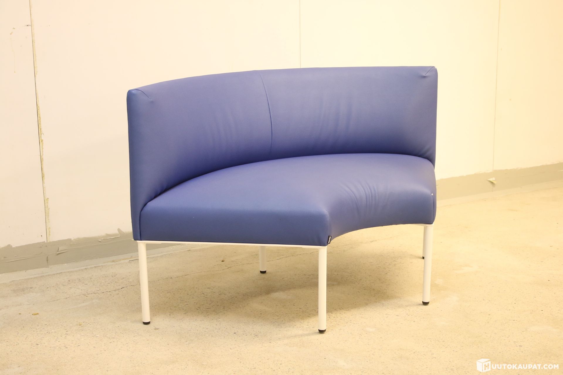 Tyylikäs kaareva Martelan Noora-sohva keinonahkaverhoilulla. Sininen / valkoinen.