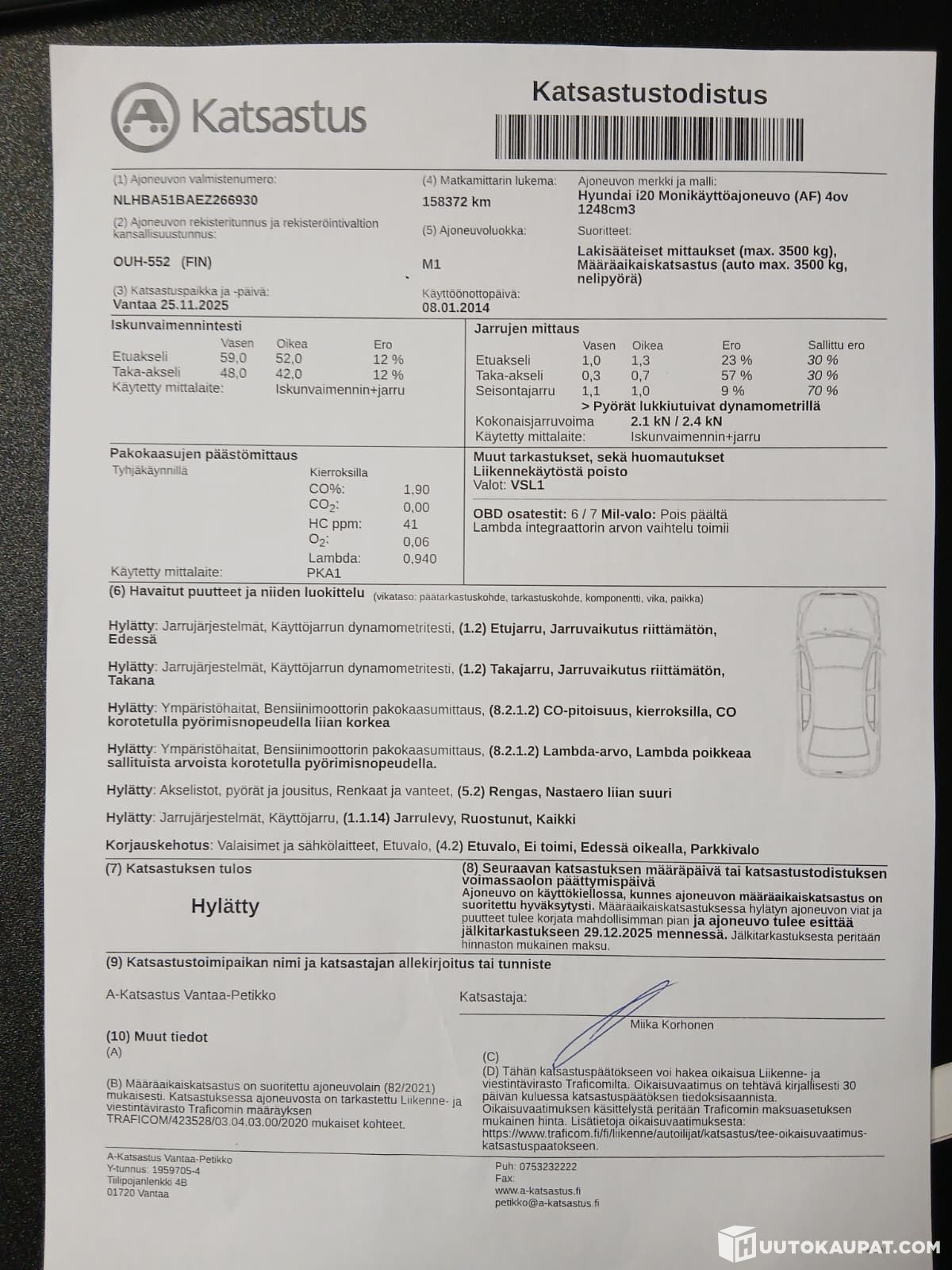 Katsastus hylätty 25.11, sen jälkeen jarrut korjattu autosta sekä eteen että taakse, muuten kaikki katsastuksella olleet viat autossa vieläkin, kuvissa katsastuslappu.