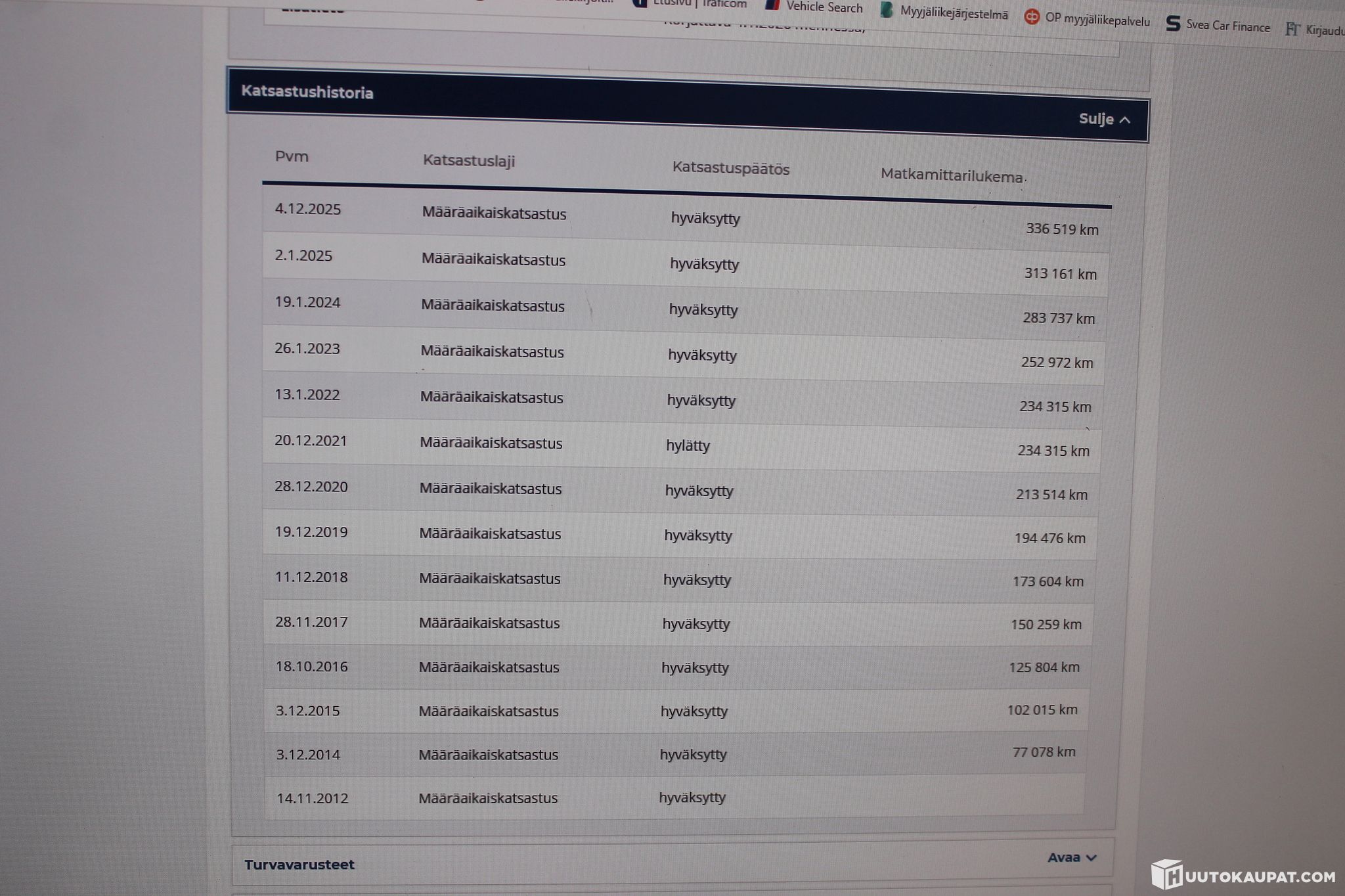 Auto ei ole ollut toimestamme teknisessä kuntotarkastuksessa eikä kaikkien varusteiden