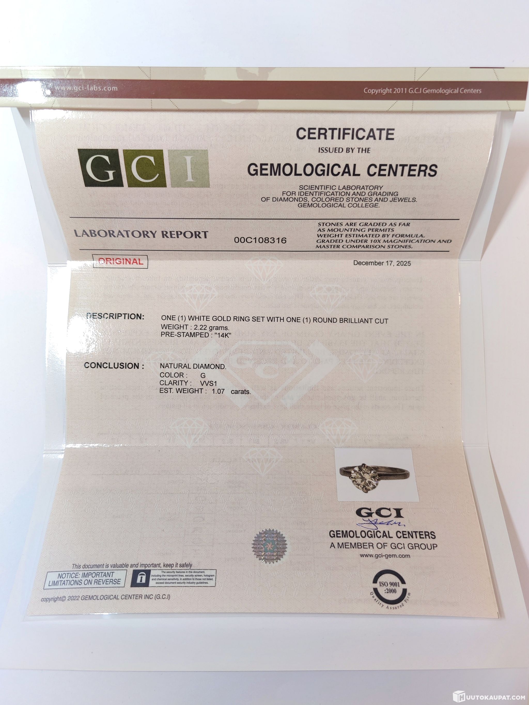 1,07ct timantti, puhtaus VSS1, väri Top Wesselton