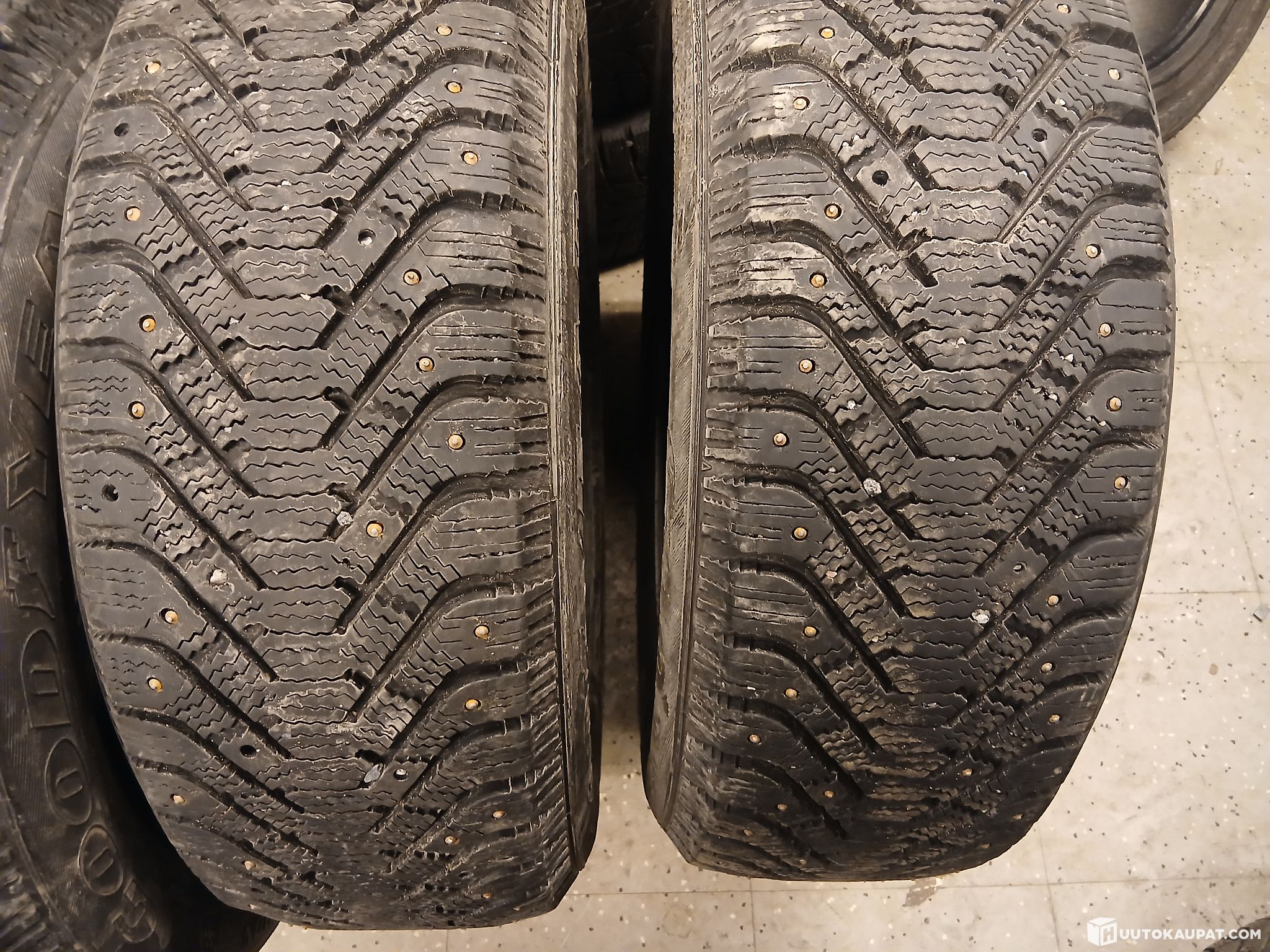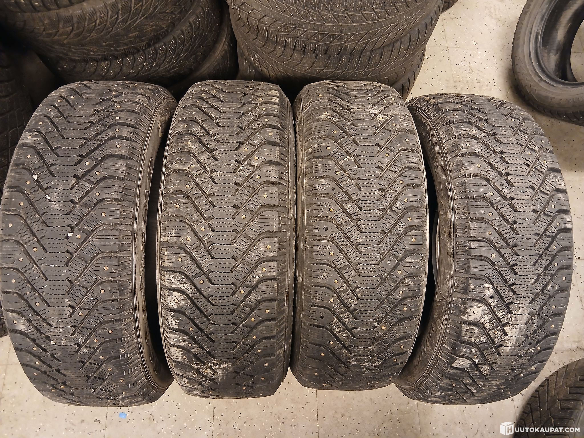 Käytetyt renkaat. Joitakin nastoja puuttuu.
