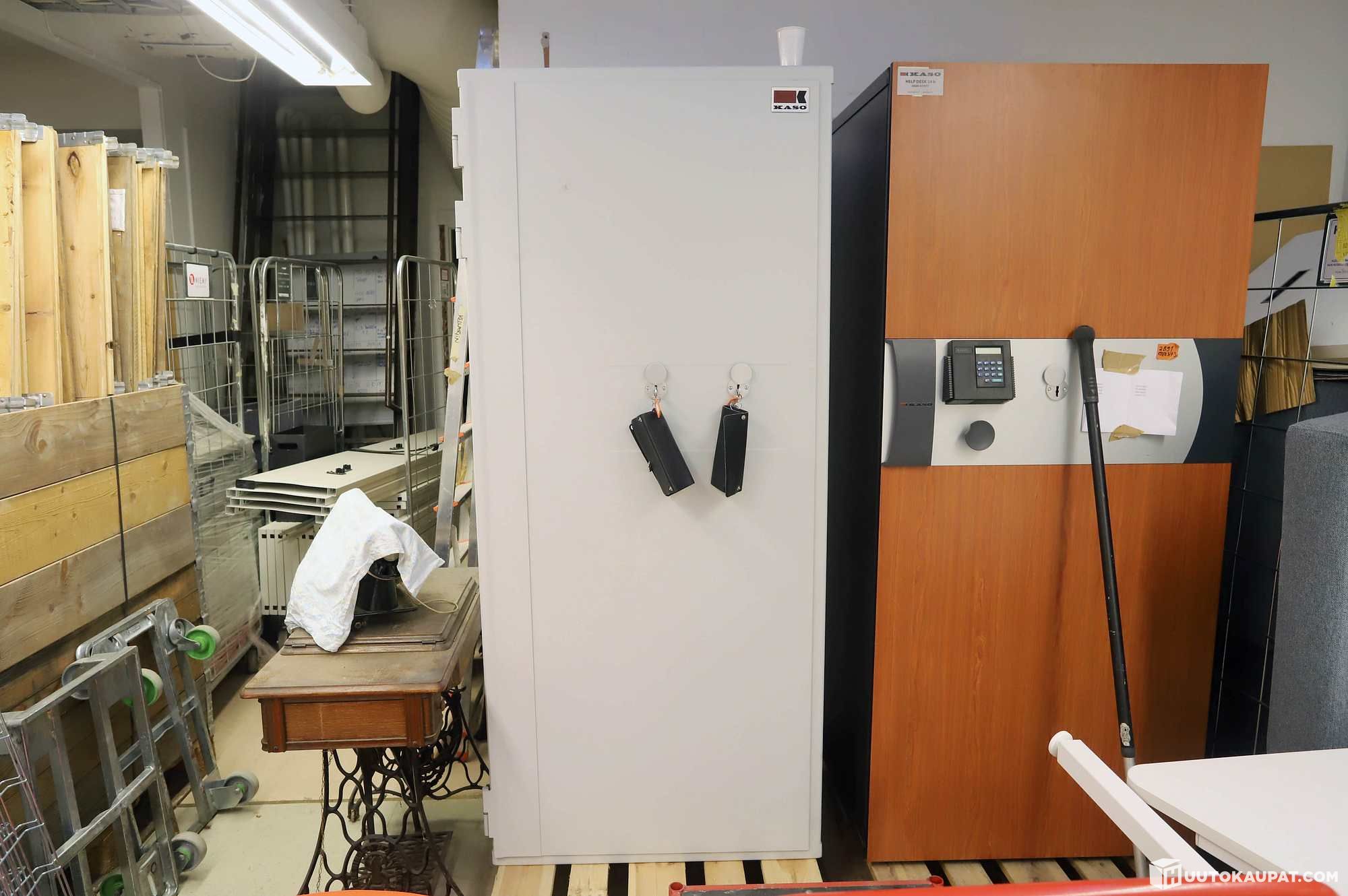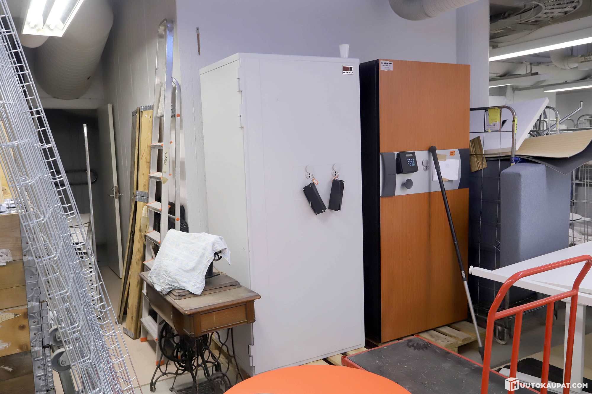 Painaa useita satoja kiloja, lastaus matalalta lastauslaiturilta. Noudettava perälaudallisella kuorma-autolla/hiabilla. Noutaja vastaa kassakaapin lastaamisesta.