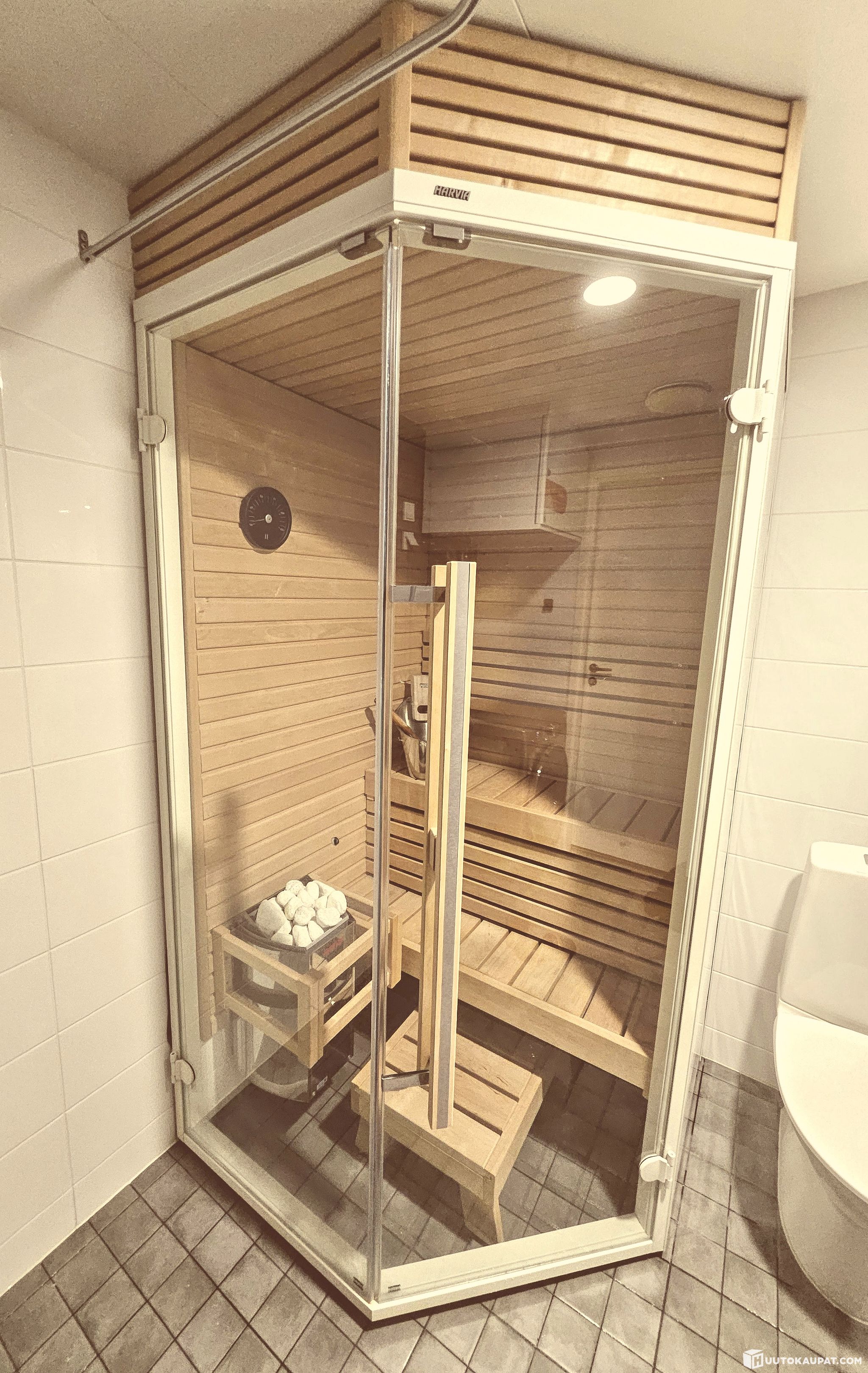 Harvian Sirius kalustesauna SC111K. Leveys 114cm, syvyys 114cm, korkeus 207cm. Korkeus koristepaneelin kanssa 230cm. Harvian Vega Compact -kiuas antaa kipakat löylyt. Kauppaan kuuluu kaikki kuvissa näkyvä; saunajakkara, teräksiset kiulu - ja kauha, lämpömittari, kiuaskivet. Ei paljon uudelle saunalle häpeä. Myös lauteet erittäin hyväkuntoiset. Sauna on purettavissa ja koottavissa uudelleen. Ostaja purkaa ja noutaa saunan kohteesta. Sijaitsee Kuopiossa. Tarvittaessa purkamisessa voidaan avustaa. Toimii moitteettomasti enkä ole löytänyt vikoja saunasta.