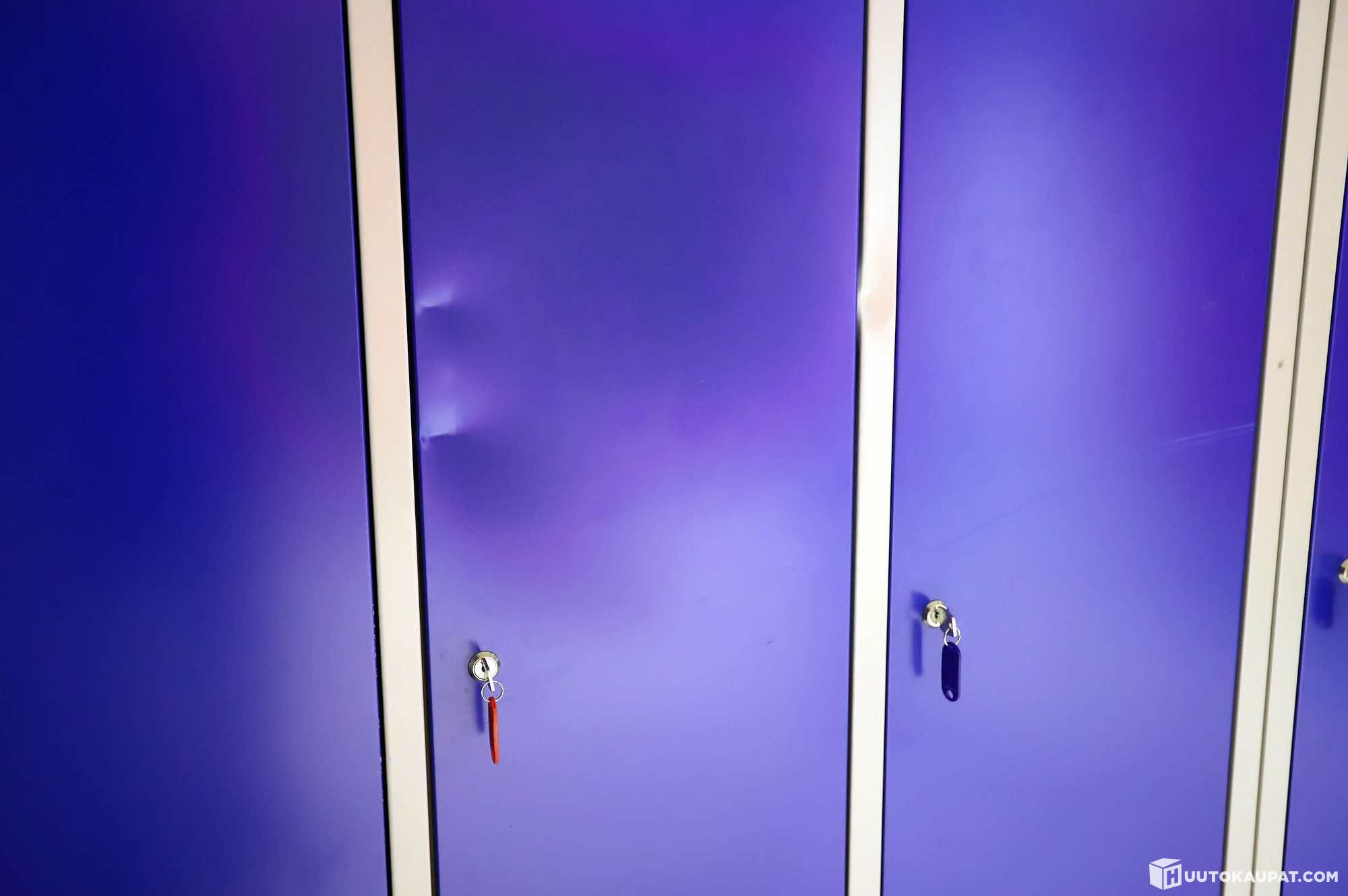 Yhdestä kaapista puuttuu lukkopesä, yhden kaapin yksi lukkopesä on porattu auki, yhden kaapin ovessa on kolhu. 13 ovea on avaimella.