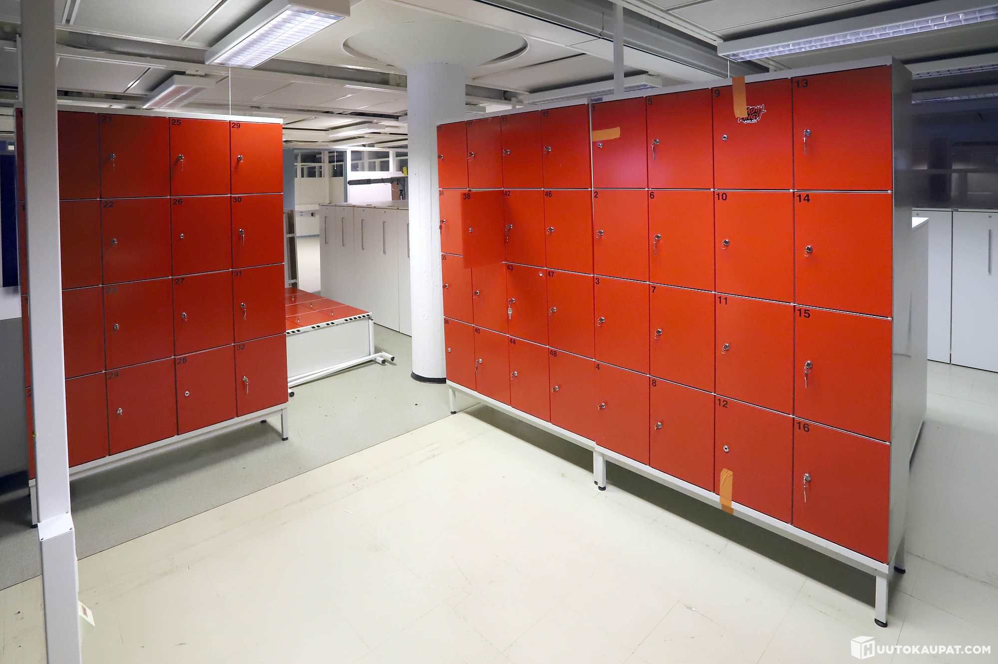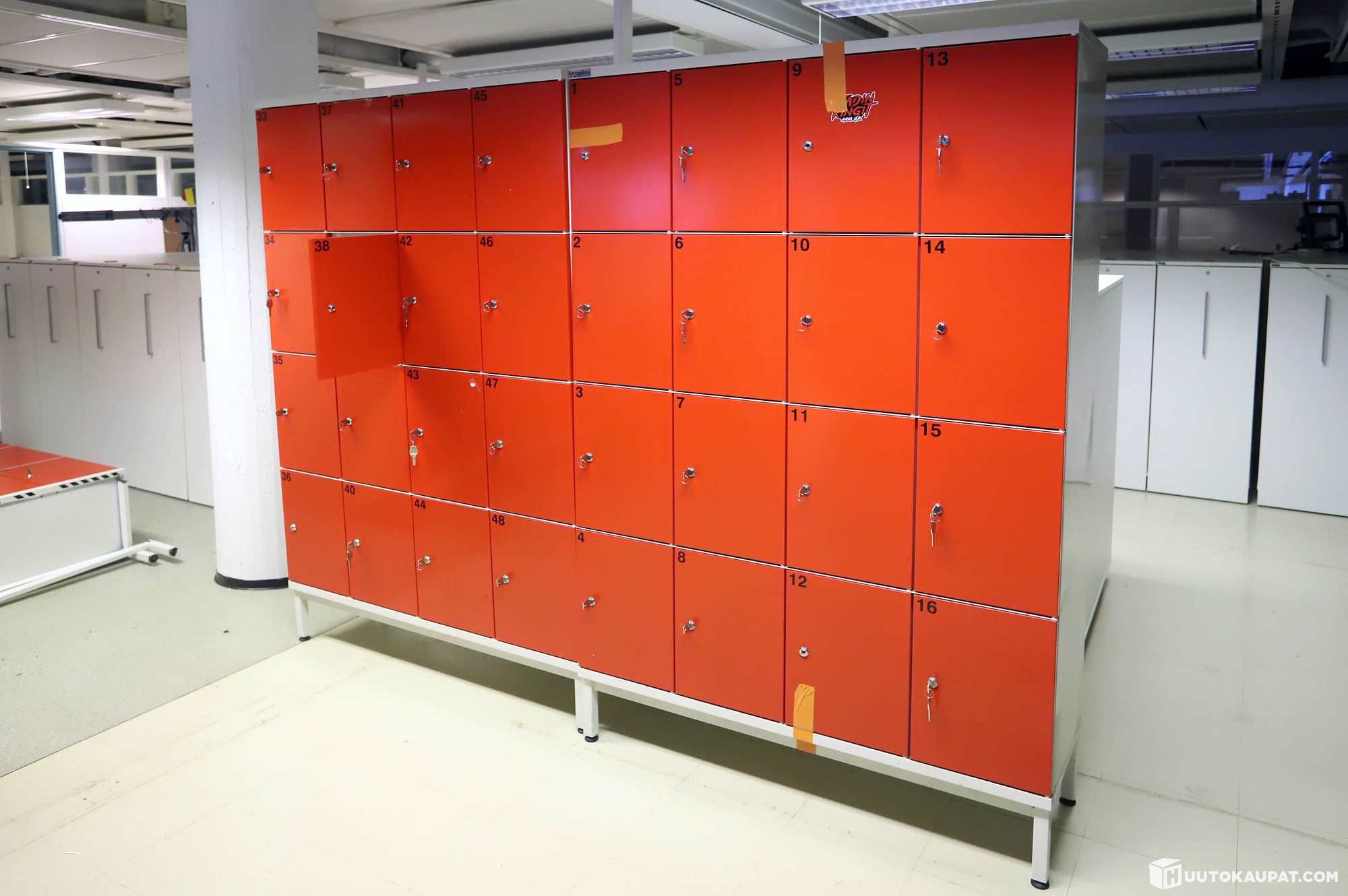 3 kpl 16:lla lokerolla. Korkeudet 190cm, leveydet 120cm, syvyydet 40cm. Kahdesta kaapista on kaksi lukkoa porattu auki, yhdestä kolme on porattu auki, muihin lukkoihin on avain.