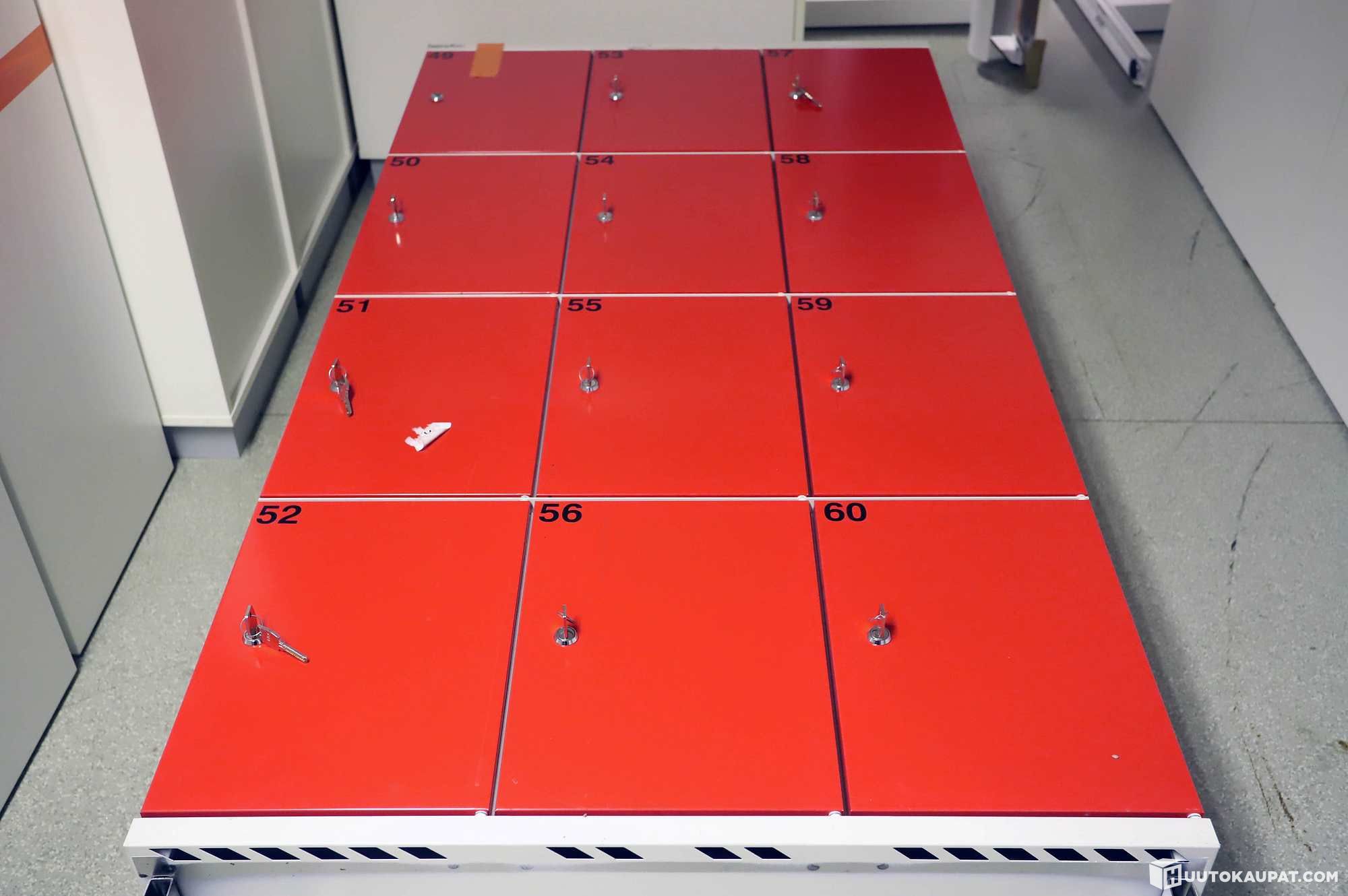 1 kpl 12:lla lokerolla. Korkeus 190cm, leveys 90cm, syvyys 40cm. Yksi lukko on porattu auki (muissa lukoissa on avain), etujalat ovat menneet poikki.