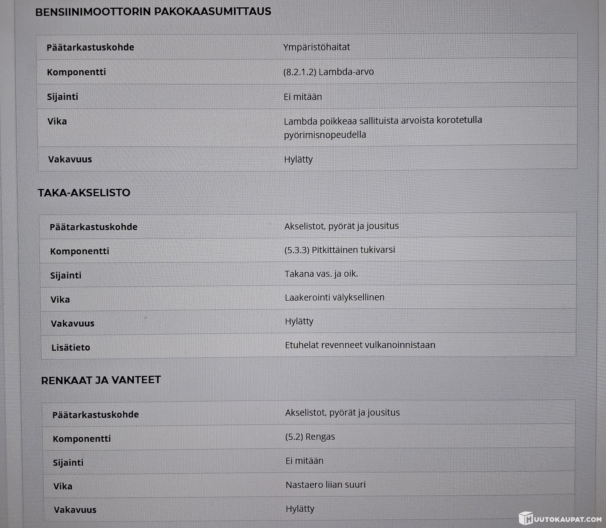 Auto ei ole ollut toimestamme teknisessä kuntotarkastuksessa eikä kaikkien varusteiden toimivuutta ole testattu. Siinä saattaa olla piileviä vikoja, joita koeajolla emme havainneet. Autoon on mahdollista tulla tutustumaan tarkemmin ennen sitovan huudon tekemistä. Sovithan tulostasi etukäteen, kiitos.