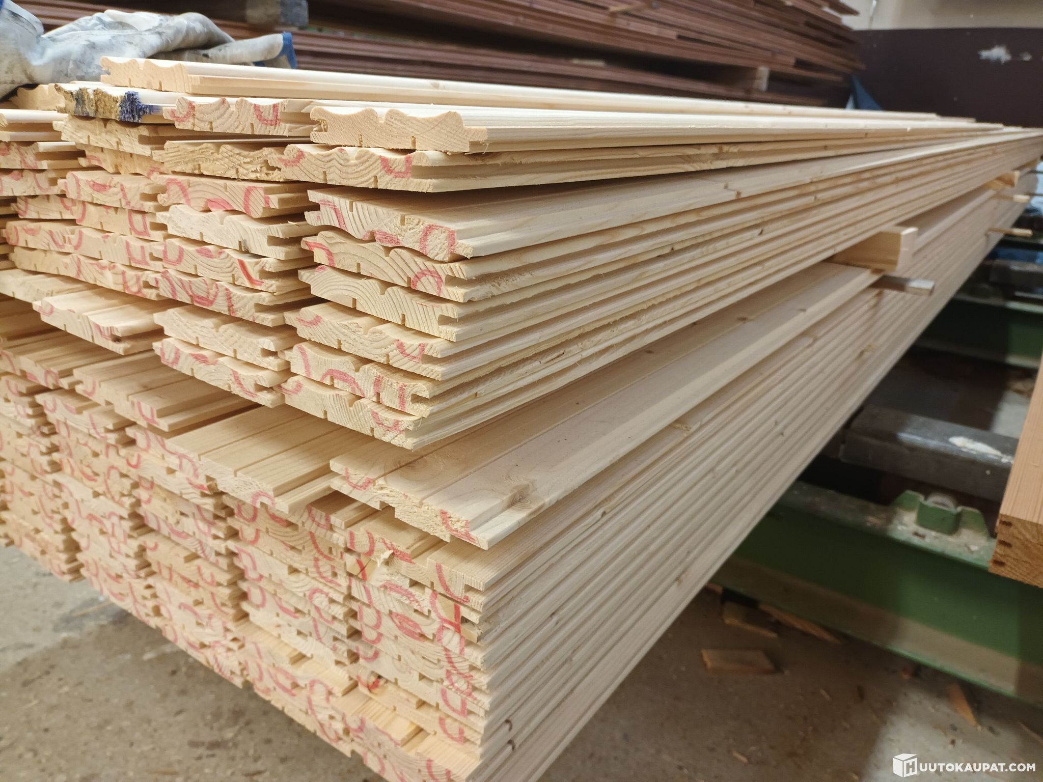 Terveoksaisesta kuusesta höylättyä Valeurapaneelia 15*95 suoraan höyläämöstä .87kpl n.4800mm pitkiä eli yhteensä 417m . n. 35 neliötä.
