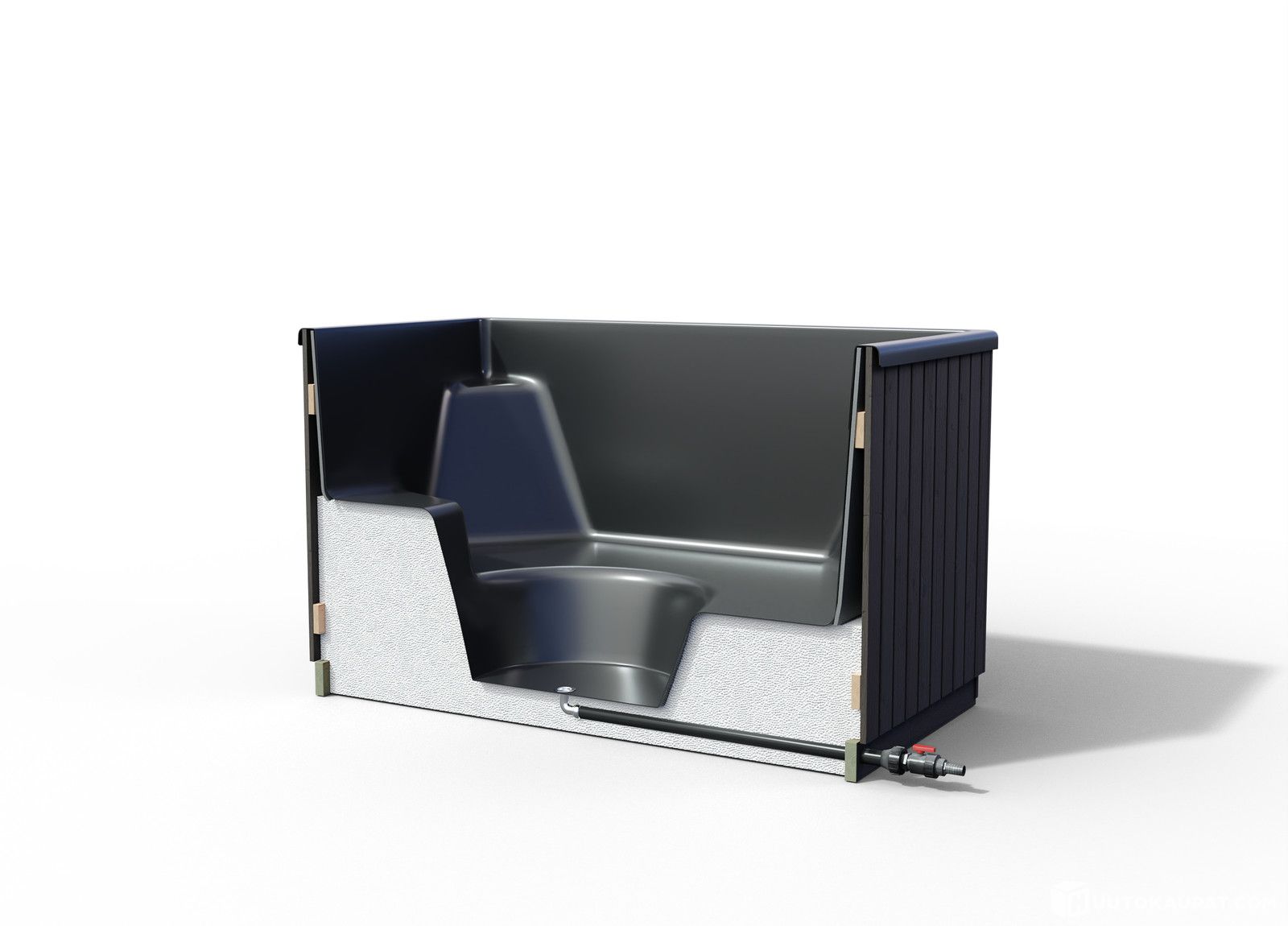 Ympäriinsä eristetty, allas eps-eristetty istuinten alapuolelta 44 cm ja altaan ympäri thermomuovi-eristys