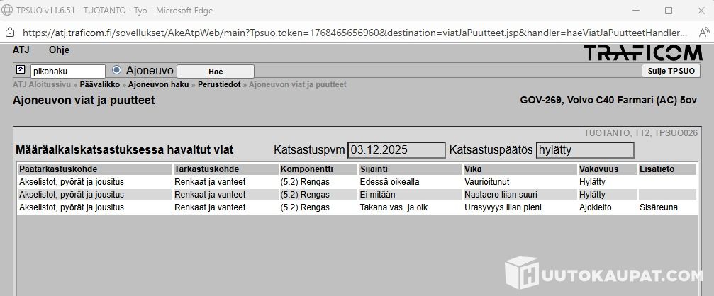 Määräaikaiskatsastuksessa havaitut viat 3.12 hylätty