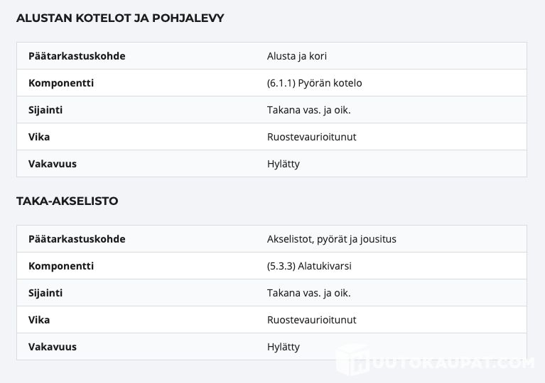 Autossa on ikäiselleen tyypillistä ruostetta, jonka vuoksi se ei läpäissyt katsastusta (hylkäysperusteena ruostevauriot takakaarissa ja alatukivarsissa). Lisäksi ovessa on naarmu ja tuulilasissa halkeama, joka ei kuitenkaan vaikuta katsastukseen.