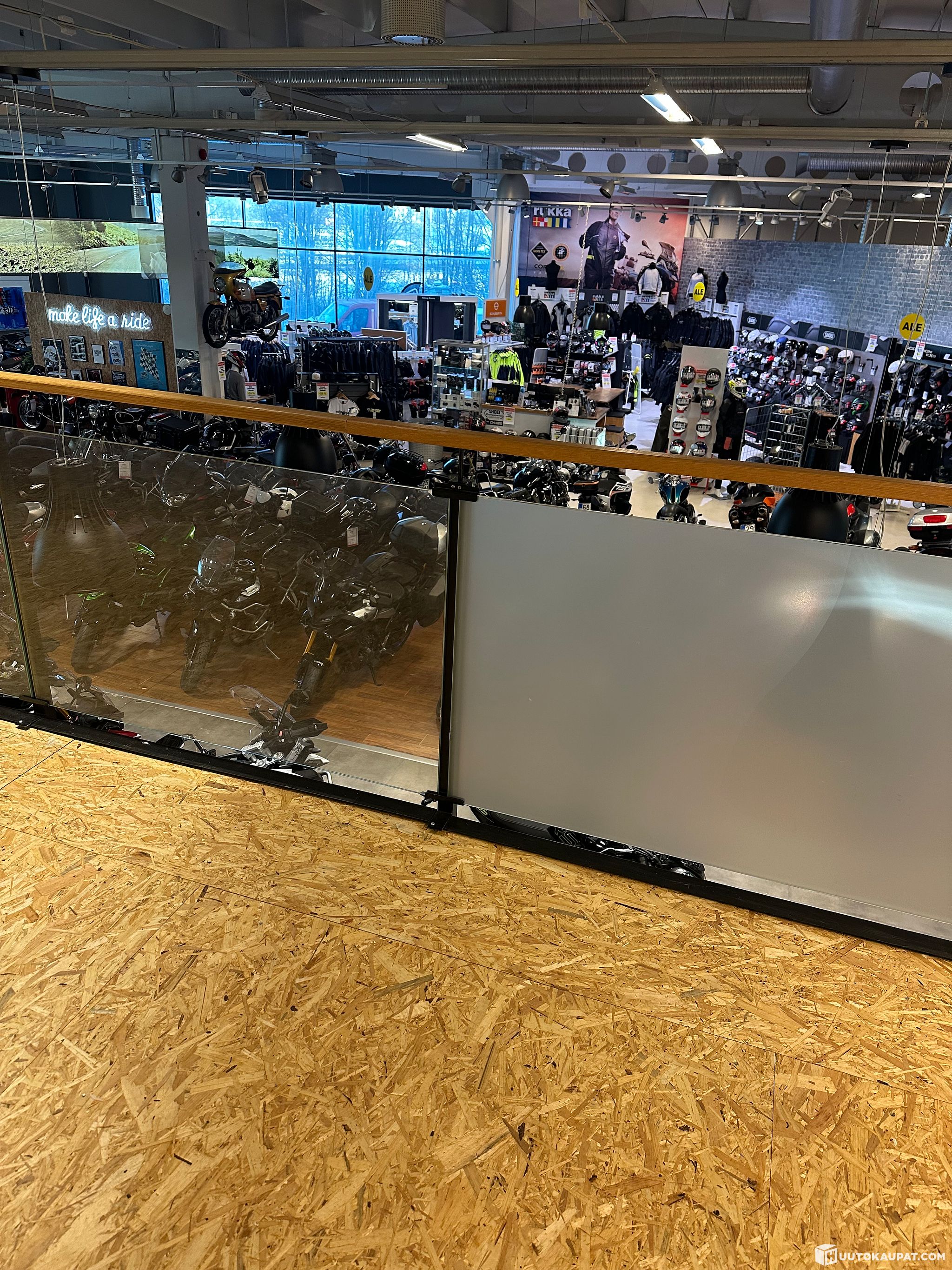 Myydään purettavaksi noin 18m leveä ja 3,2m syvä kakkostaso myymäläkäytöstä. Erittäin tukeva ja raskas. Mustat metallisosat, lasikaide, joista osa teipattu umpeen. Tehty pulttiliitoksilla ja leveyttä voi muuttaa 6metrin osissa. Lattian korkeus maasta 2,73m. Portaat ja kulku molemmistä päistä, toisessa päässä myös luiska. lisäksi lasikaiteissa portti. Ostajan on purettava taso ja siirrettävä se pois helmikuun 16. päivään mennessä omalla kustannuksellaan Tuote nähtävissä myymälässä liikkeen aukioloaikoina.