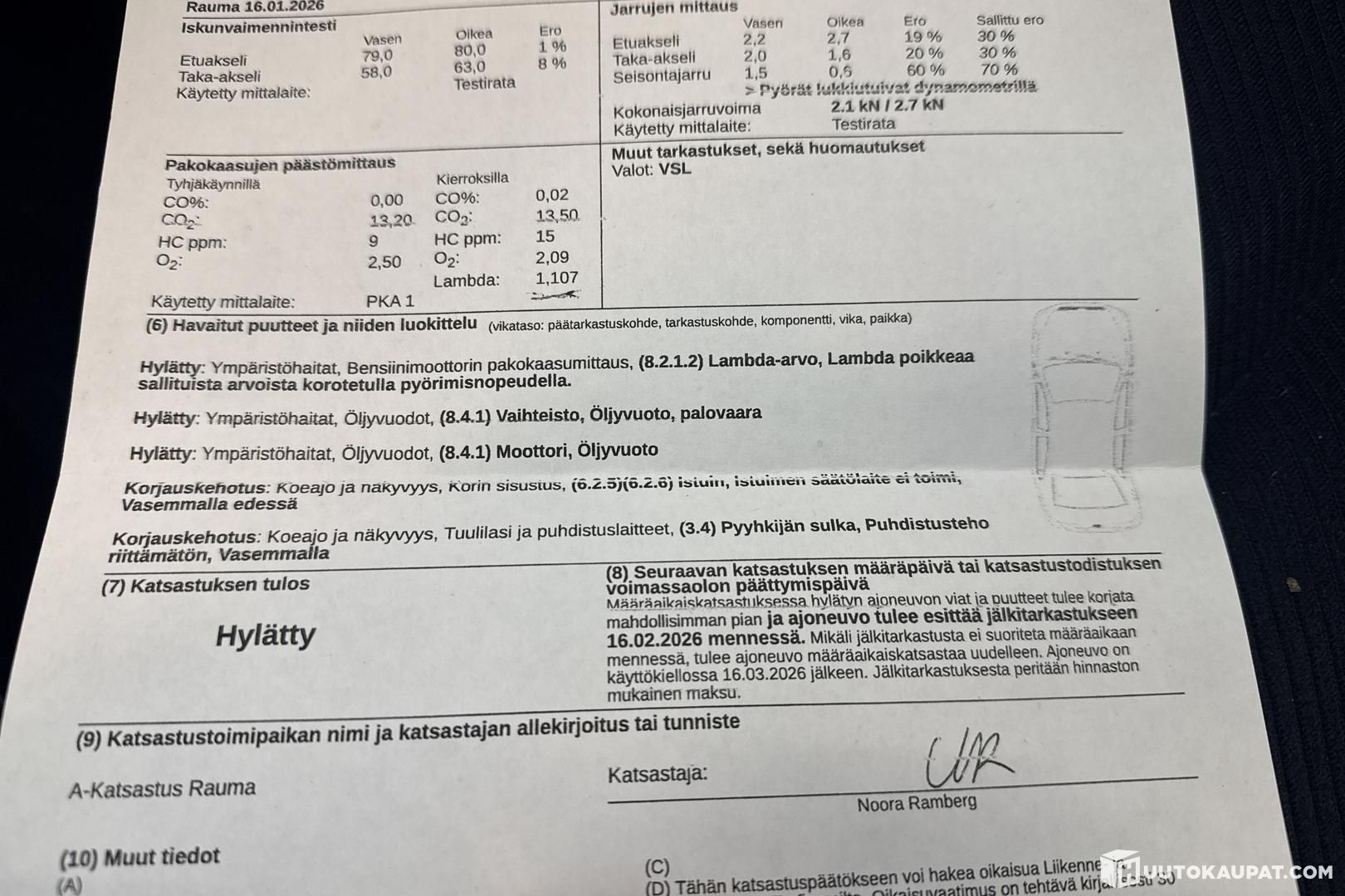 Hylätty katsastuksessa Lambda-arvosta sekä moottorin ja vaihteiston öljyvuodoista. Korjauskehotukset istuimen säädöstä ja pyyhkijänsulasta. Katso vikalista kuvista.