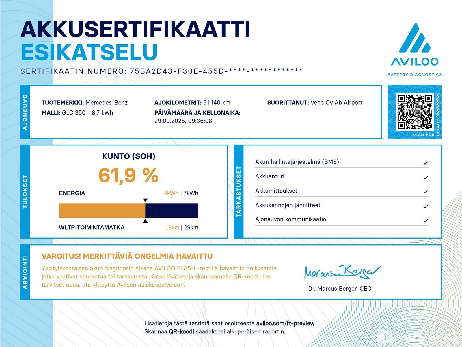Auto ei ole ollut toimestamme teknisessä kuntotarkastuksessa eikä kaikkien varusteiden toimivuutta ole testattu. Siinä saattaa olla piileviä vikoja, joita koeajolla emme havainneet. Autoon on mahdollista tulla tutustumaan tarkemmin ennen sitovan huudon tekemistä. Sovithan tulostasi etukäteen, kiitos.