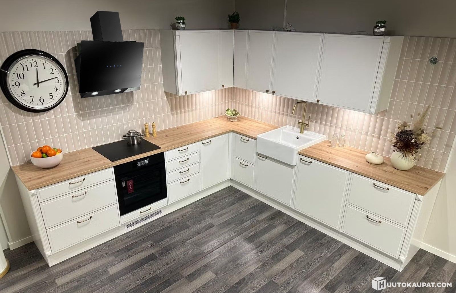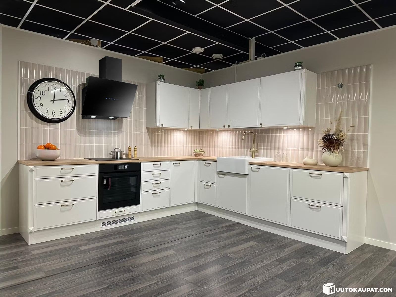 Topi-Keittiö Aurora uusilla kodinkoneilla, altaalla ja hanalla varustettuna (malliryhmä). Aurora on klassinen vaalea keittiö johon Irlannin tammi laminaattitasot tuovat lämpöä ja kontrastia. Kokonaisilmeen viimeistelee mustat kodinkoneet ja koristepilasterit.