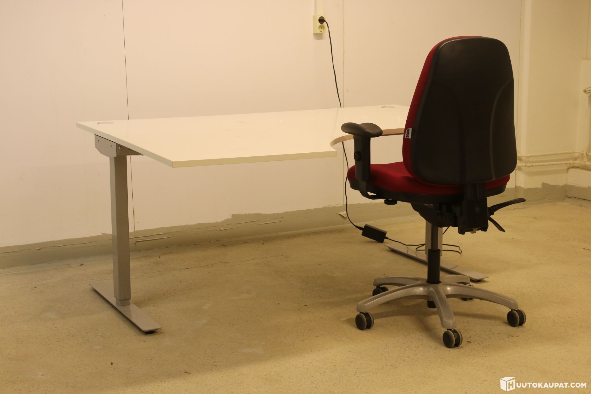 Sähköpöytä kulmakannella sekä kuvan mukainen työtuoli. Tuoli väriltään viininpunainen / pinkkiin taittuva. Säädöt toimivat.
