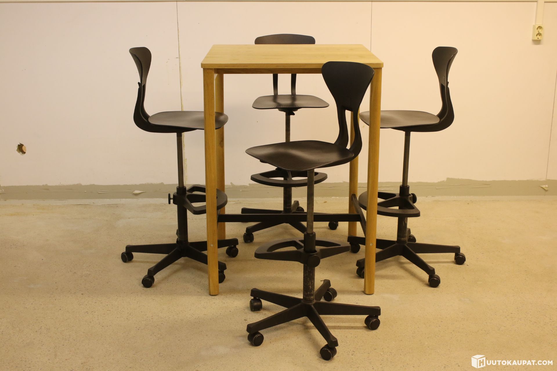 Laadukas tammen värinen pystypöytä ja neljä Martelan korkeus säädettävää Ray-tuolia.