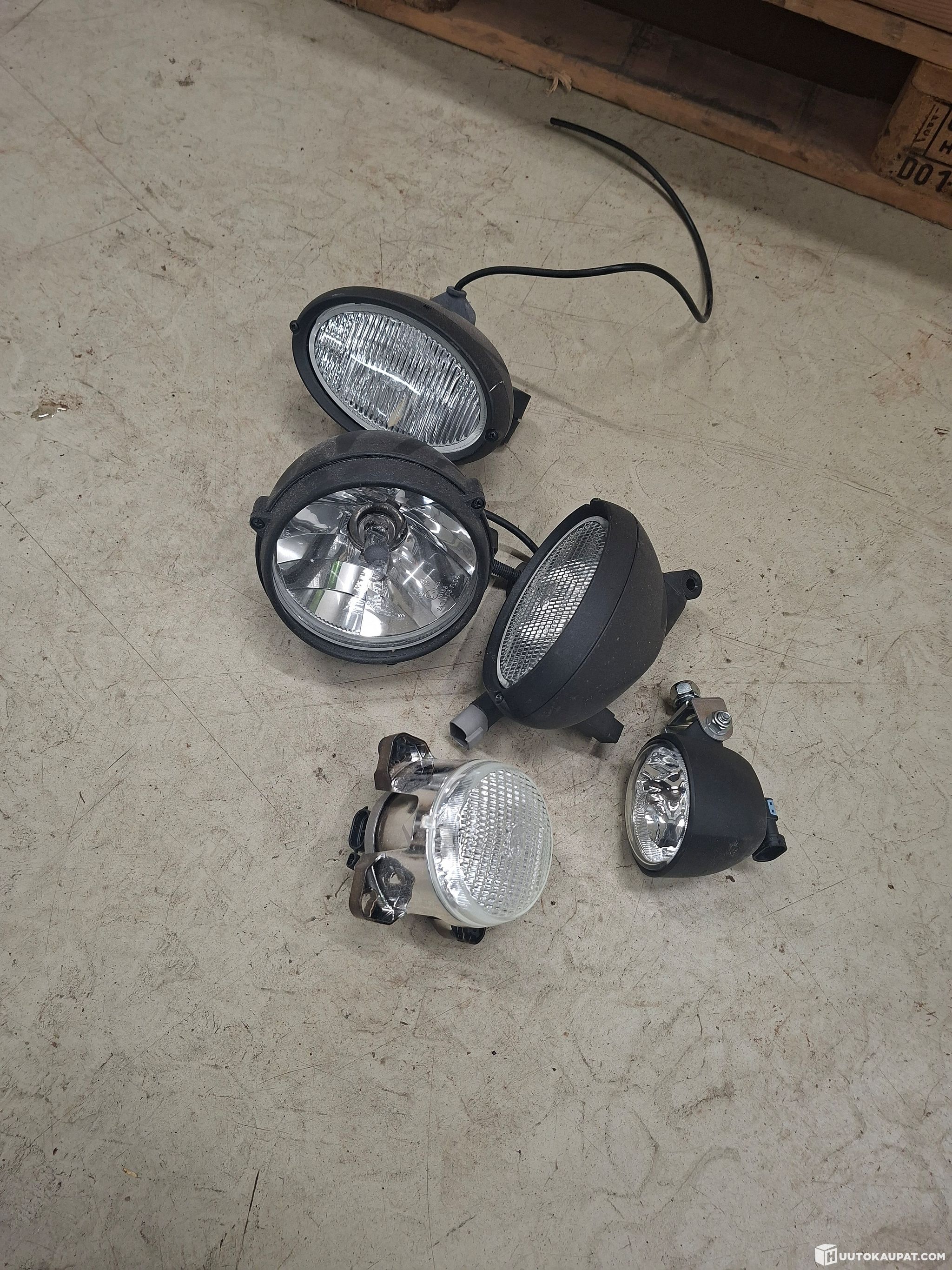 Myynnissä uusista työkoneista irrotettuja työvaloja.