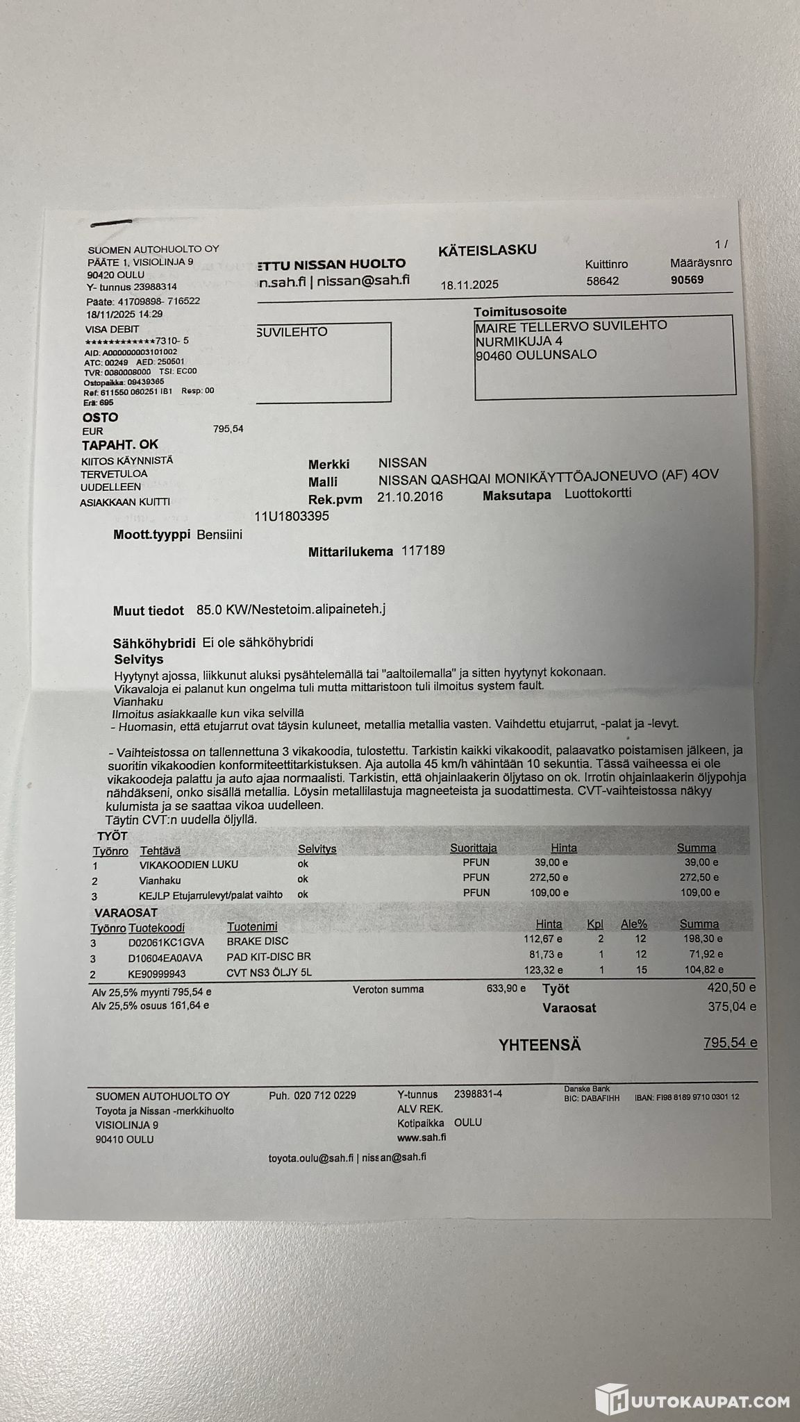 Kuvissa korjaamon tekemä diagnoosi siitä mikä autoa tällä hetkellä vaivaa. Kylmänä toimii normaalisti mutta kun vaihdelaatikko lämpeää niin alkaa nykyttämään. Autolla suoritettu kuitenkin kunnon koeajo auton edelliseltä omistajalta Sakalle.