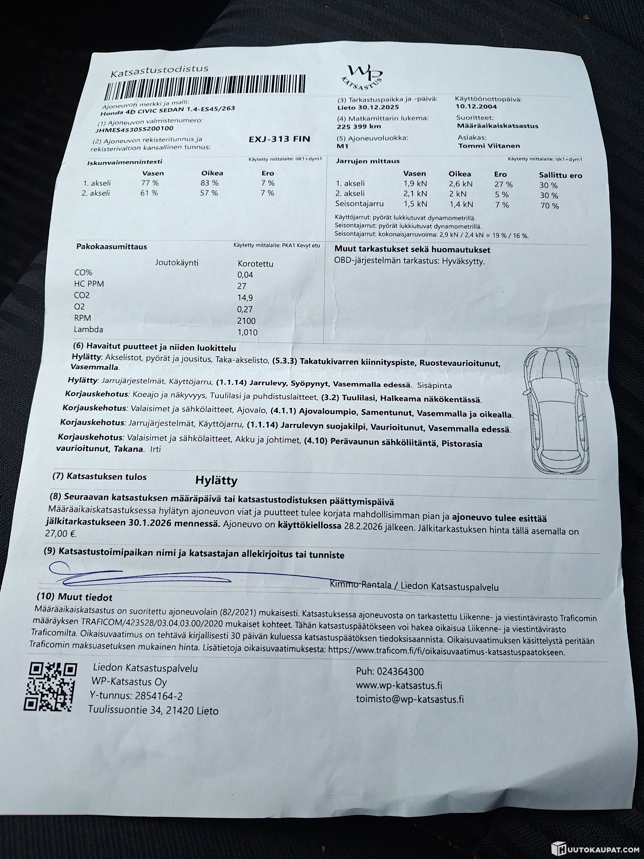 Katsastuksen vikalista kuvattu, ajoaikaa 28.2.2026 asti