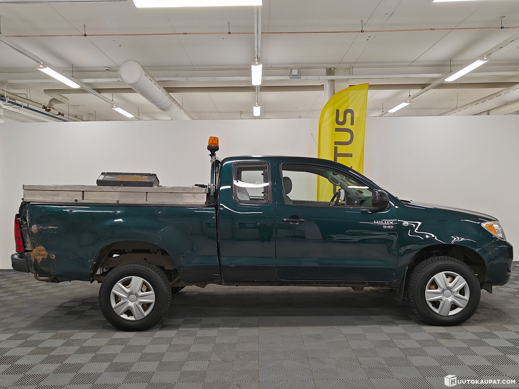 Auto on ollut työkäytössä, ja sen mukaiset käytön jäljet ovat selvästi näkyvissä. Tämä ei ole siistikuntoinen yksilö, vaan rehellinen ja kovaan käyttöön tehty Hilux, jossa paino on tekniikassa eikä kosmetiikassa. Tekniikaltaan auto tuntuu toimivan normaalisti ja on juuri huollettu.