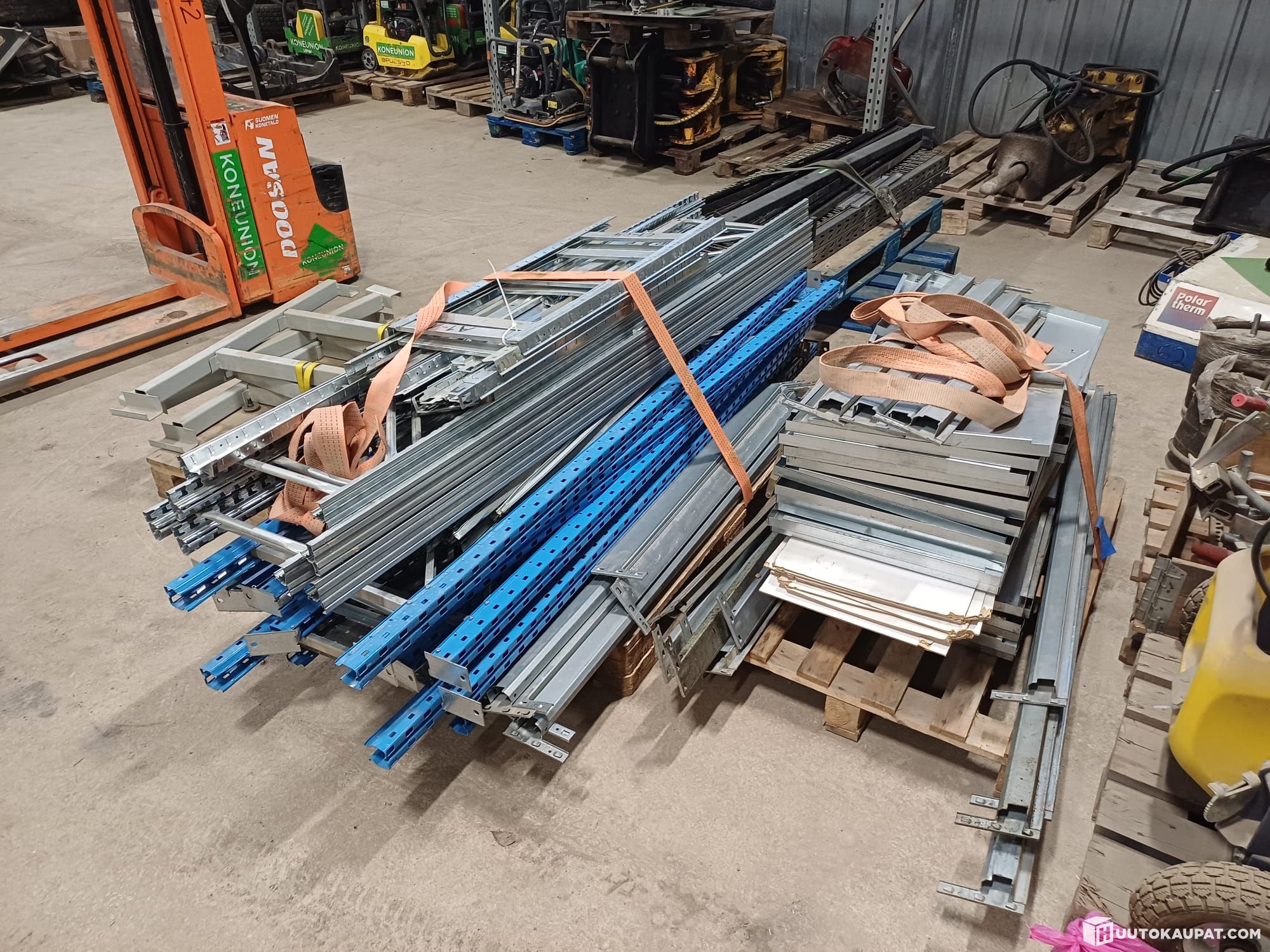 Käytettyjä varastohyllyjä ainakin kahta eri mallia.