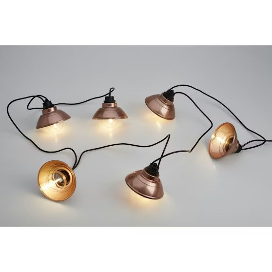 6-osainen metallilamppuvalosarja ulko- ja sisäkäyttöön. Kuparin väristen metallilamppujen halkaisija 10 cm. Lamppuväli 50 cm, 5 metrin musta johto, IP44-muuntaja. Paloikä noin 10 000 tuntia. Jännite on 31 V ja teho 3,6 W.