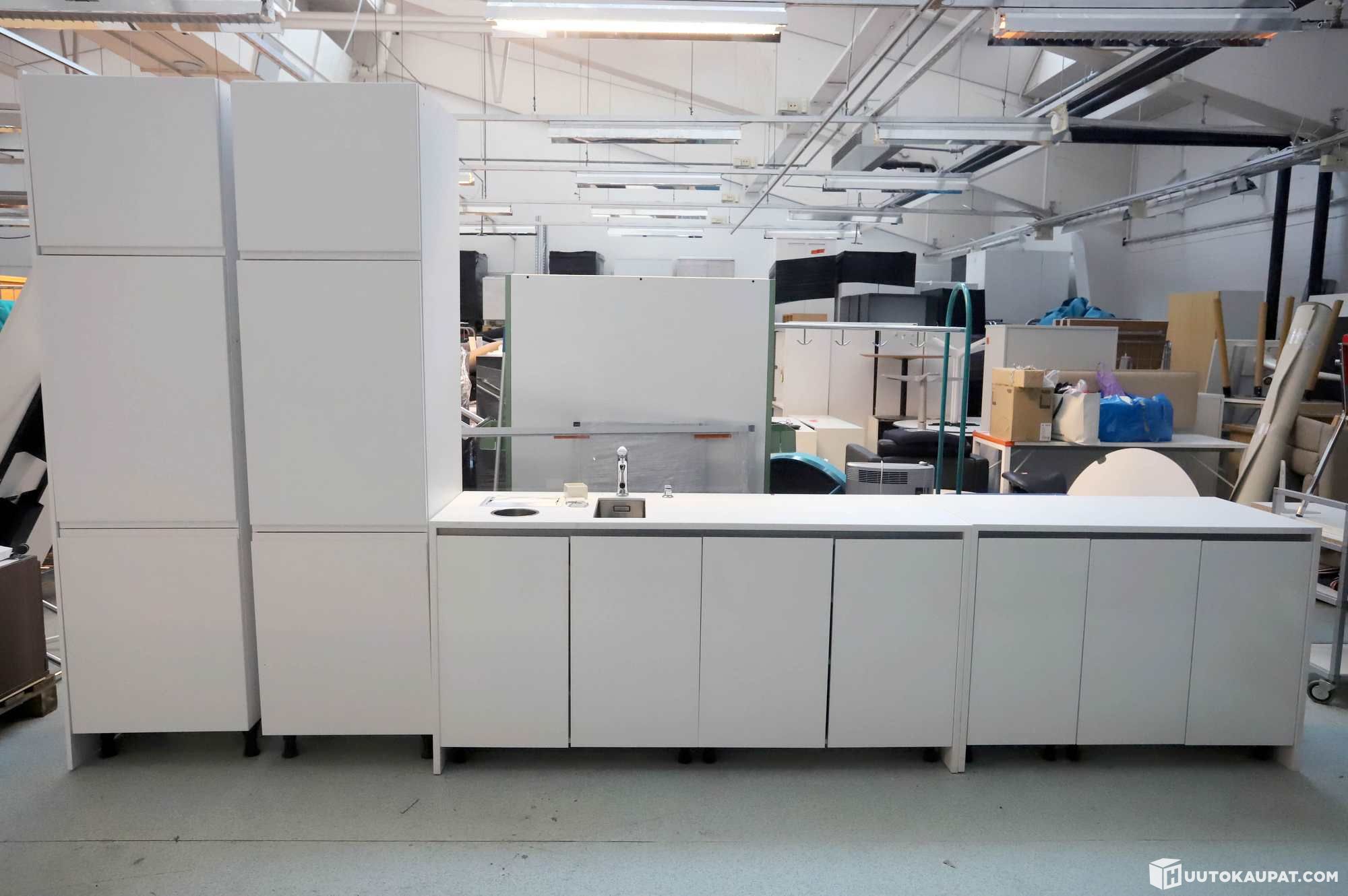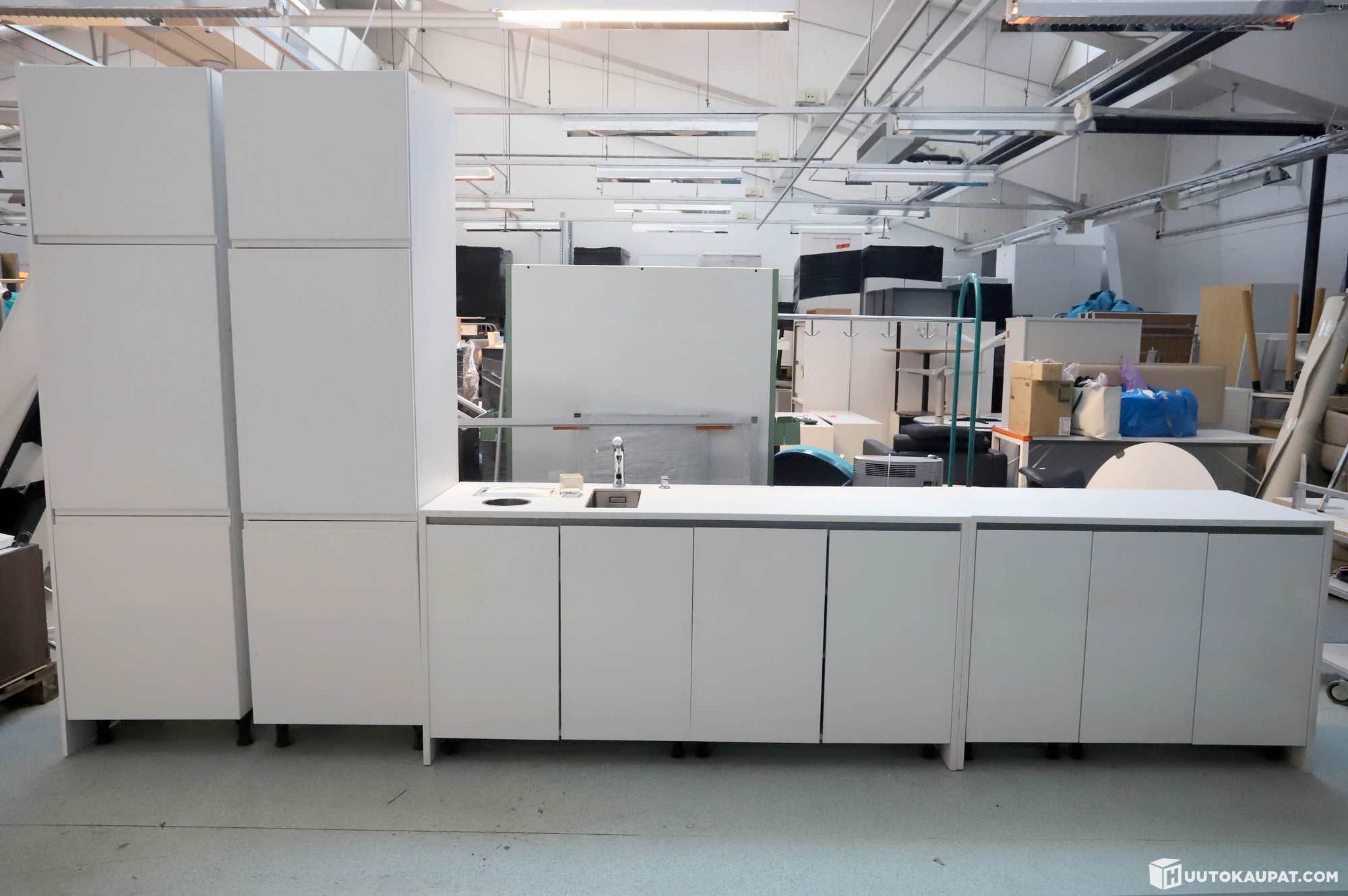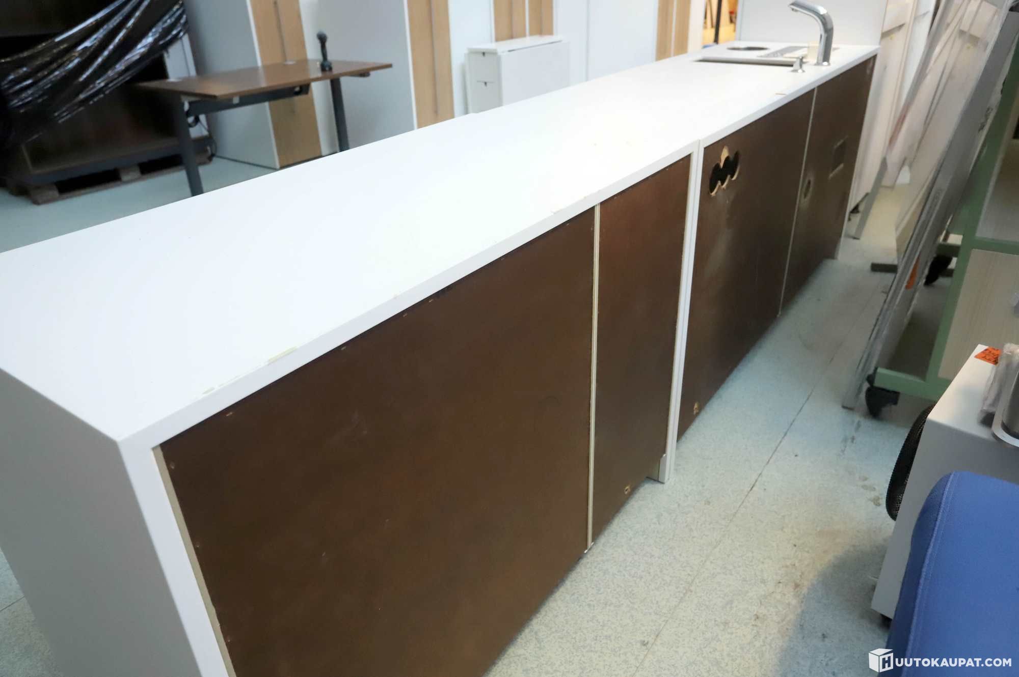 Allastaso ja taso korkeakiiltoisilla ovilla sekä kaksi korkeaa kaappia vetolaatikoilla.
