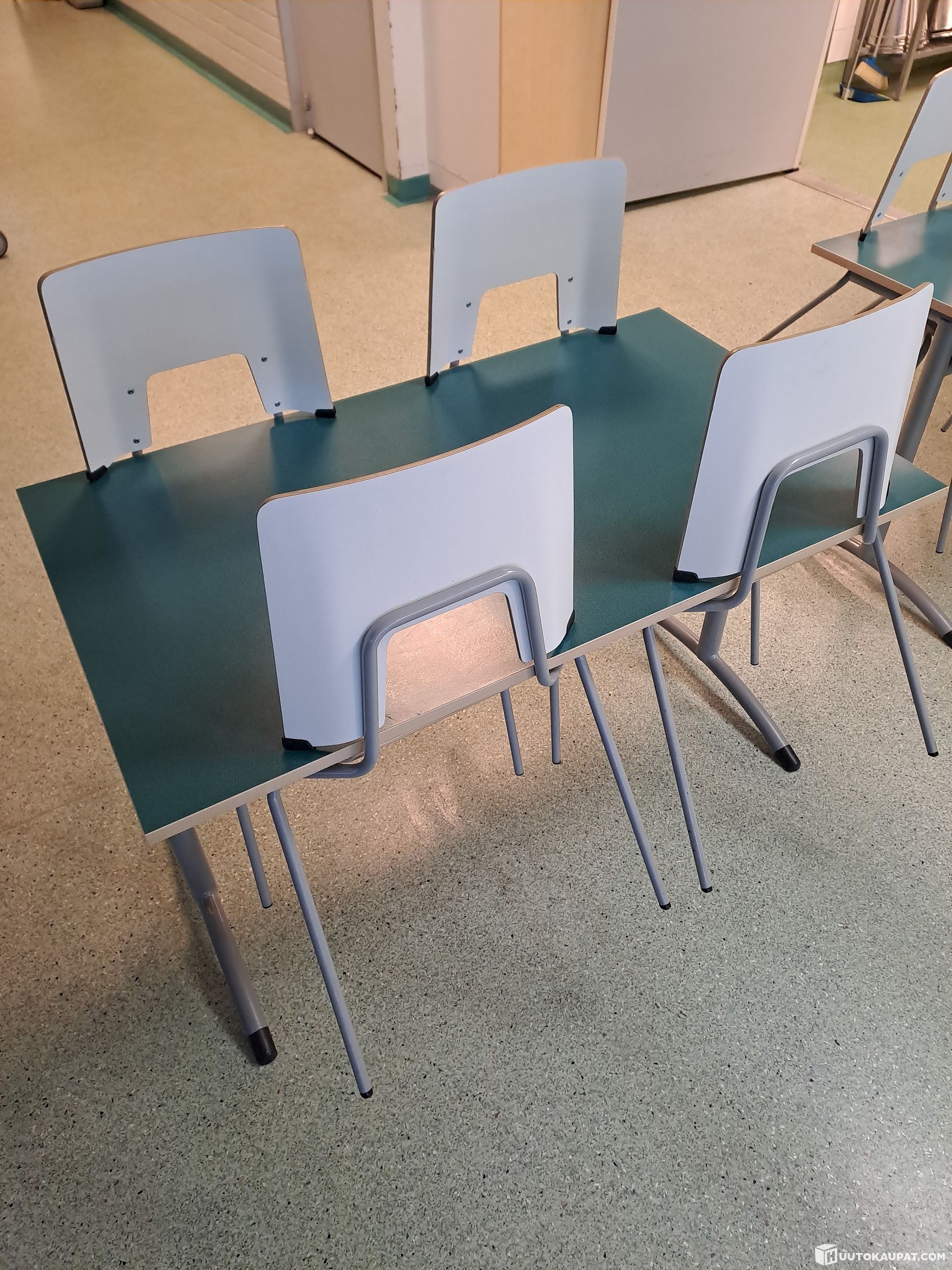 Käytetty koulun ruokasalissa, Pöydän reunalistoja ja tuoleja voi olla vaurioitu