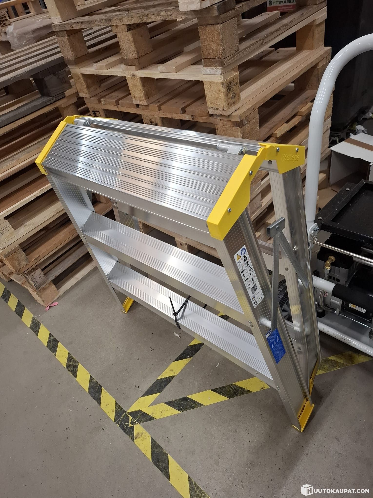 Wibe/W.steps 3500 Työpukki 3-askelmainen. Työpukissa kuljetusvaurio, yksi työpukin jaloista hieman vääntynyt, näkyy kuvissa 2 ja 3.